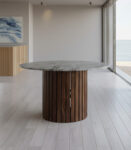 Materiales: Mesa circular con cubierta de piedra y base de madera, en una gran variedad de materiales.