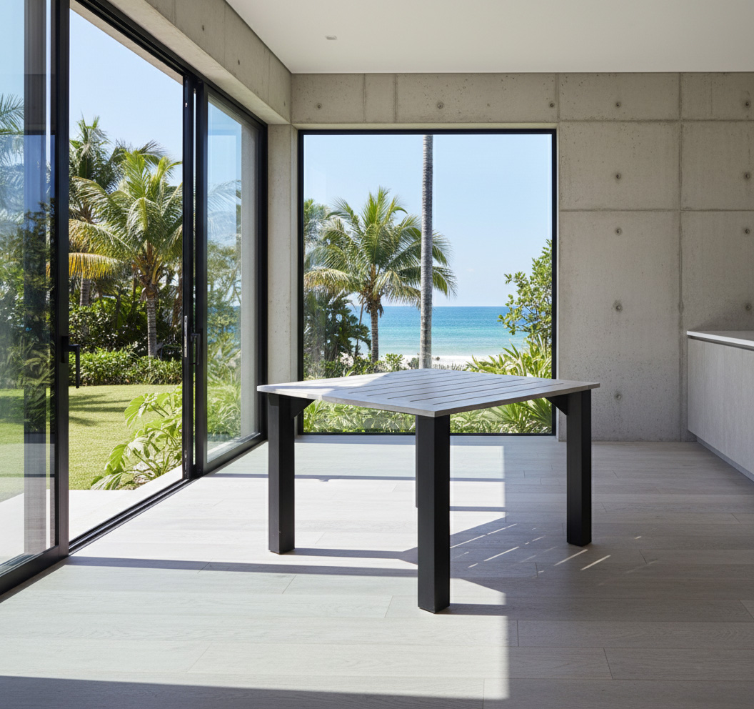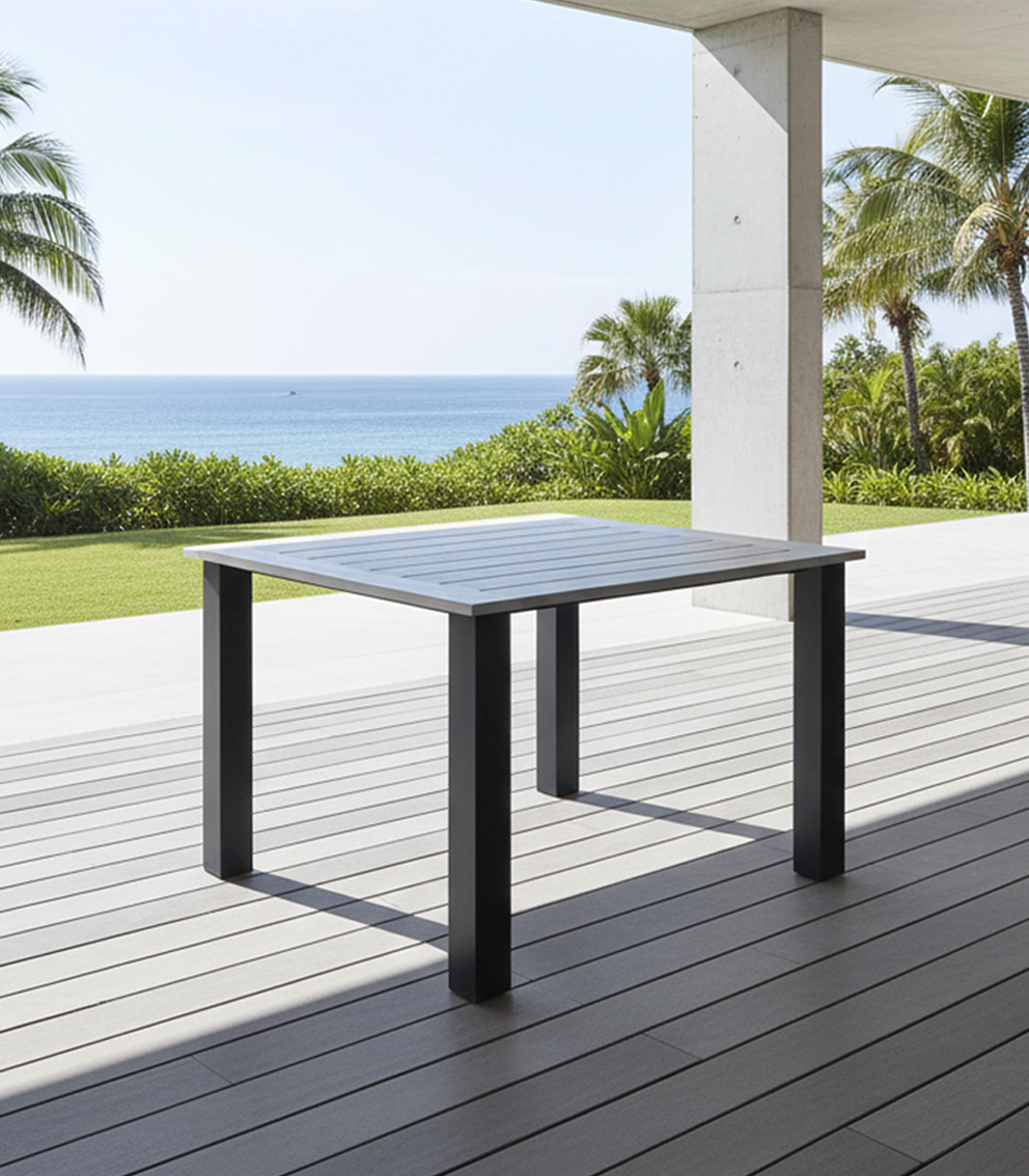 Materiales: Mesa para 4 sillas, fabricada con cubierta de madera y una base de aluminio cubierta con pintura electrostática para mayor resistencia a los elementos.