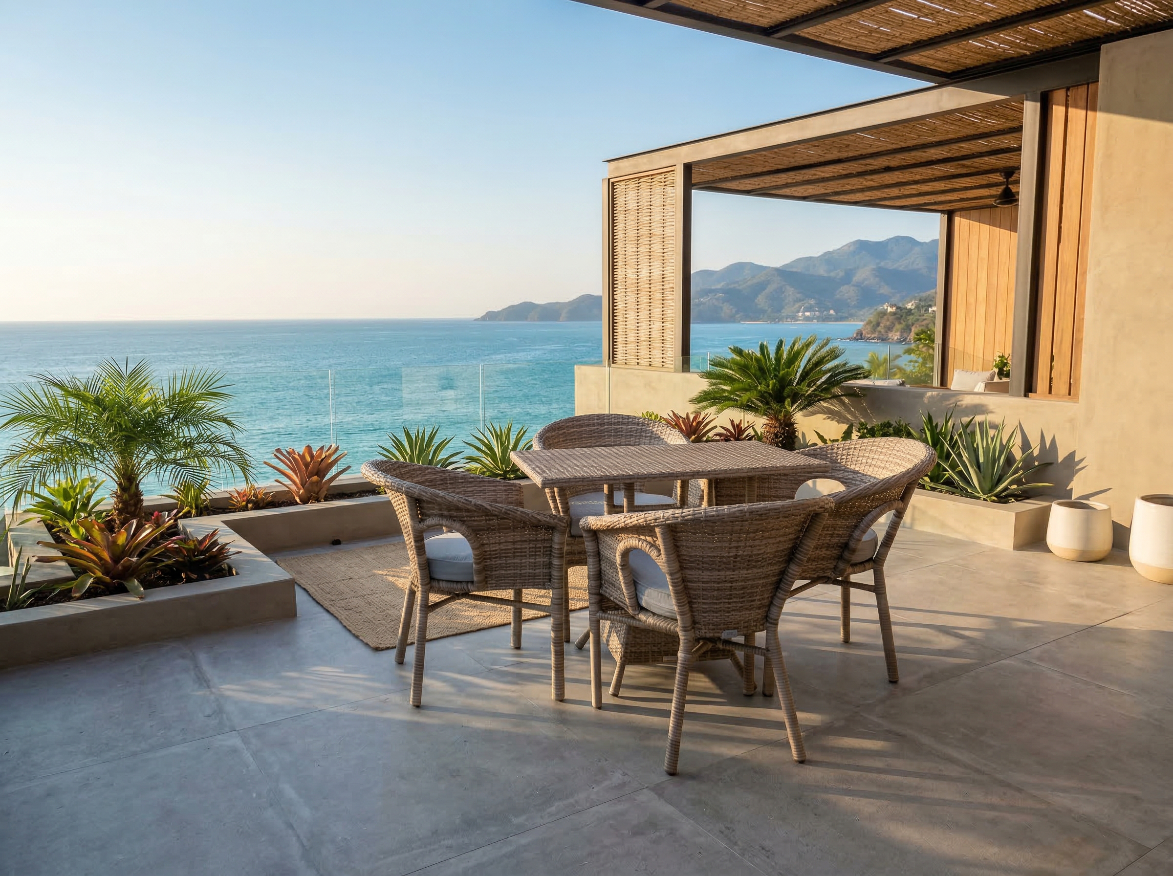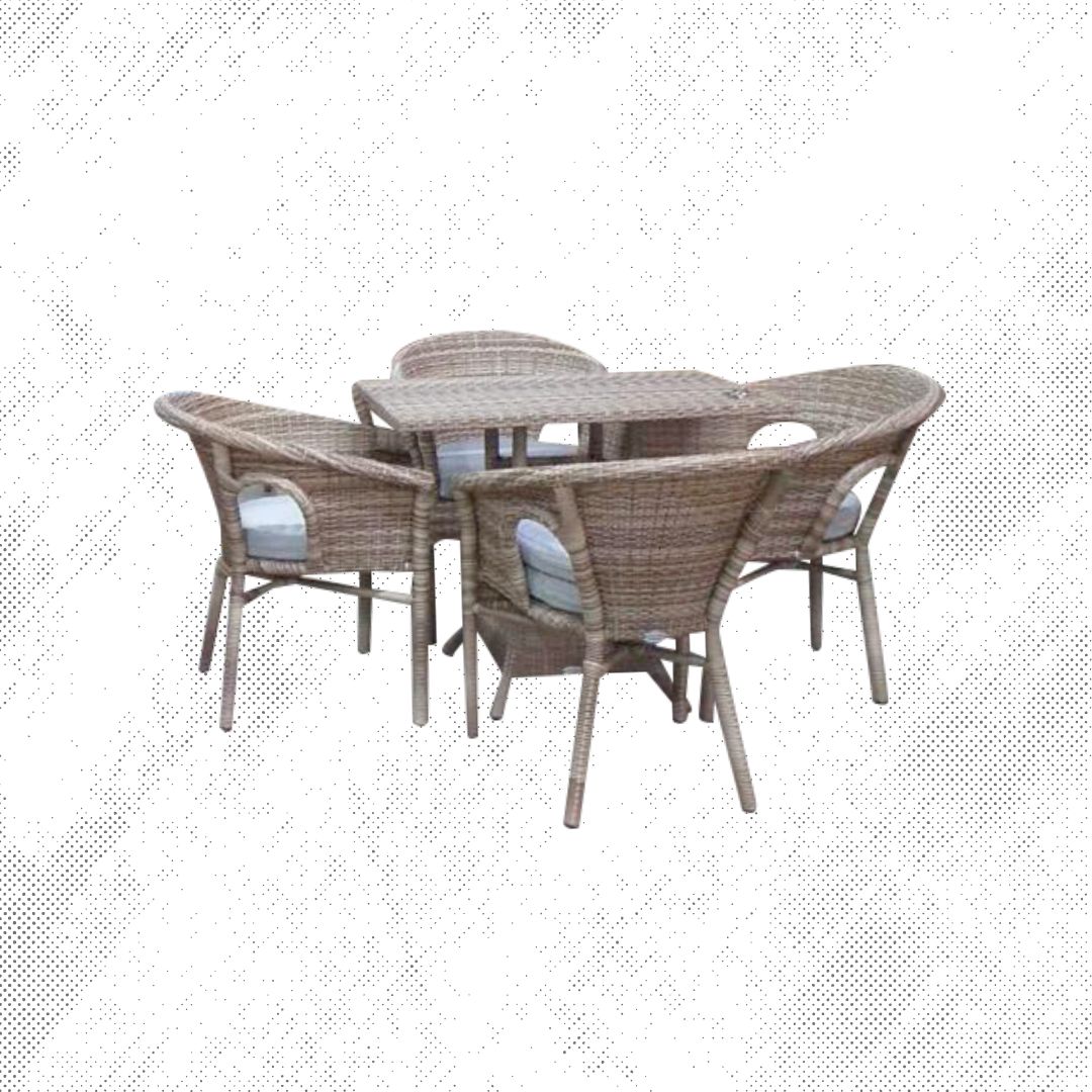 Materiales: Mesa cuadrada con estructura de aluminio tejida con rejilla sintética y una cubierta de cristal templado, 4 sillas modelo Palapa tejidas con rejilla sintética, cojineria en tela resistente al sol y la intemperie.