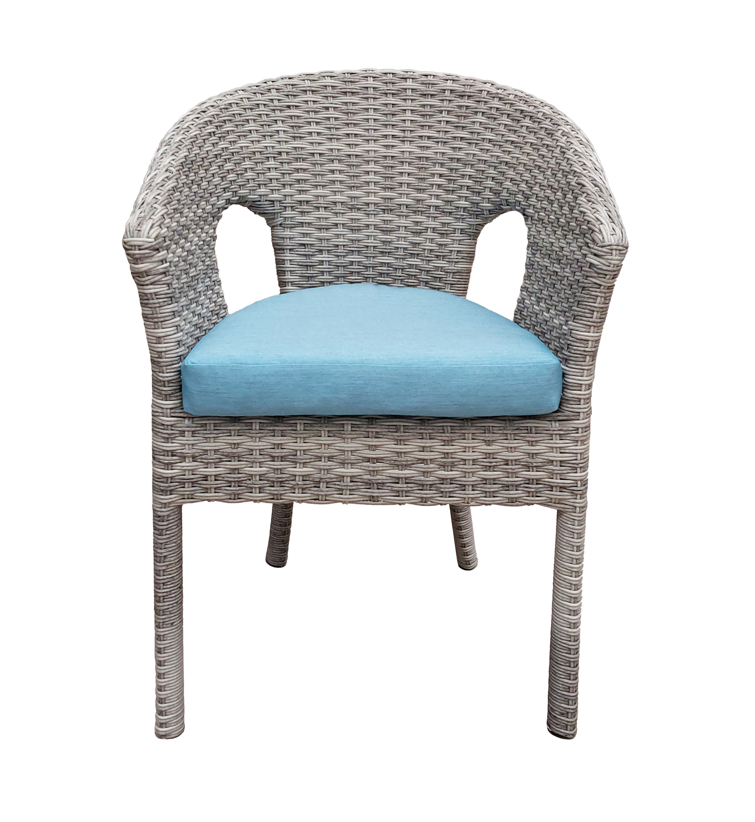 Materiales: Mesa redonda con cubierta de propileno y 4 sillas modelo Niza, estructura en aluminio, tejido con rejilla sintética, cojineria fabricada con hule espuma de alta densidad y tela resistente al sol y la intemperie.