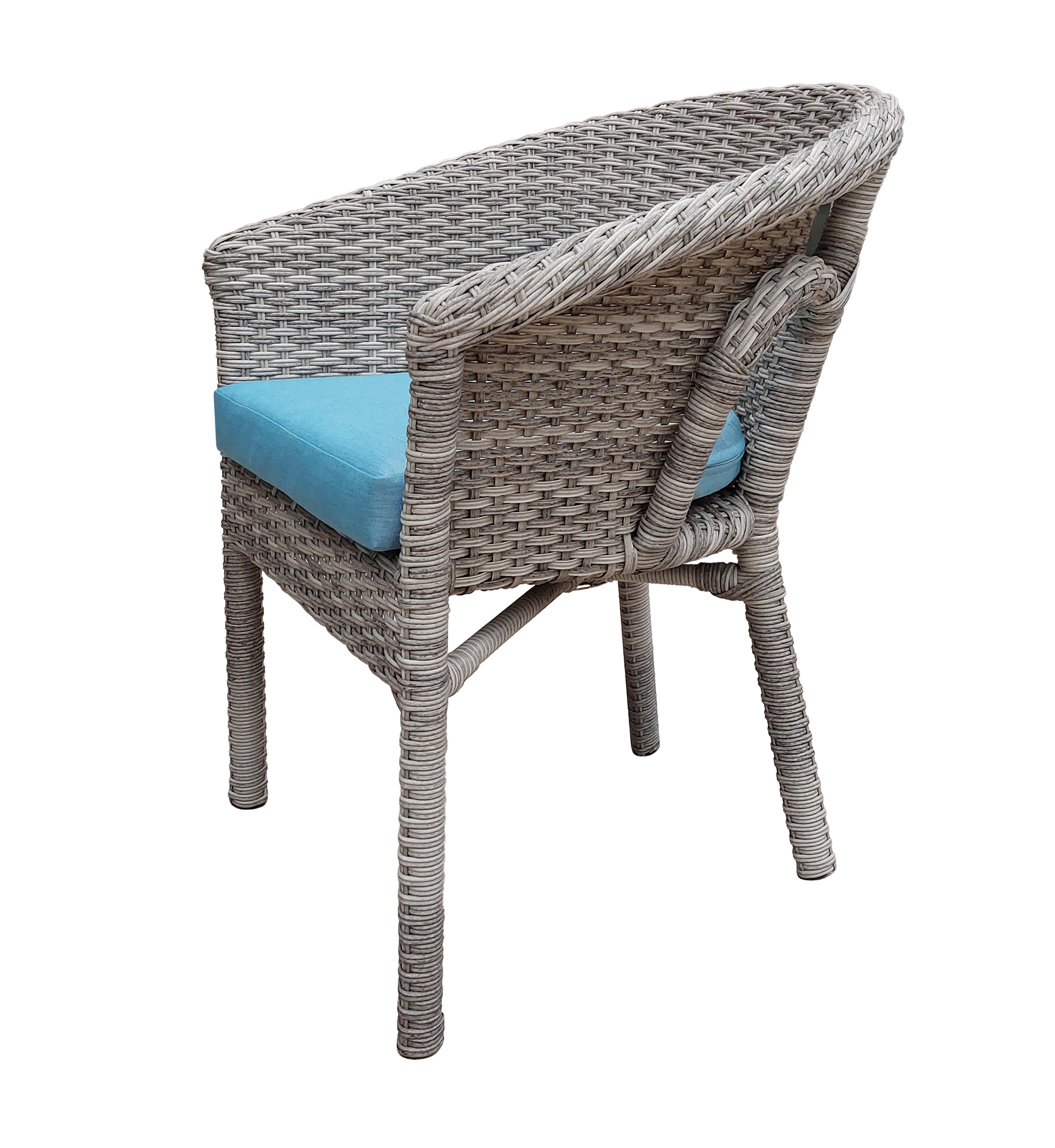Materiales: Mesa redonda con estructura y cubierta de madera de teca y 4 sillas modelo Victoria, tejidas con rejilla sintético y una base de madera de teca, cojines en tela resistente al sol y la intemperie.