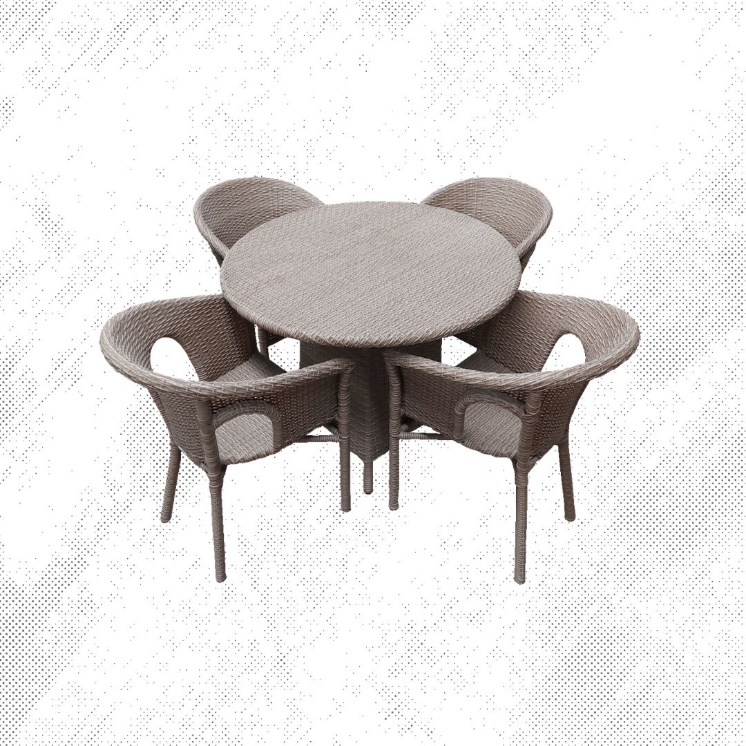 Materiales: Mesa circular con estructura de aluminio tejida con rejilla sintética y una cubierta de propileno, 4 sillas modelo Zebra tejidas con rejilla sintética, cojineria fabricada con espuma de alta densidad, tela resistente al sol y la intemperie.