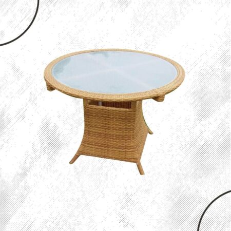 Mesa redonda con cubierta de cristal, estructura de aluminio tejida con rejilla sintética de alta calidad.