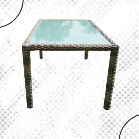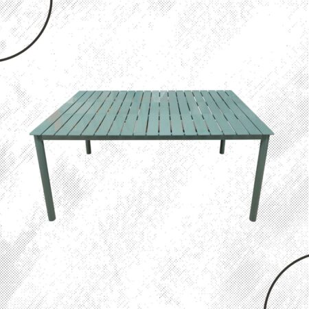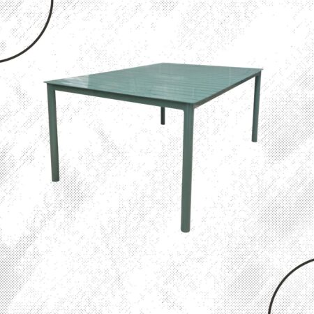 Mesa rectangular para 6 sillas, fabricada con estructura y una cubierta de aluminio y una capa de pintura electrostática para mayor resistencia.