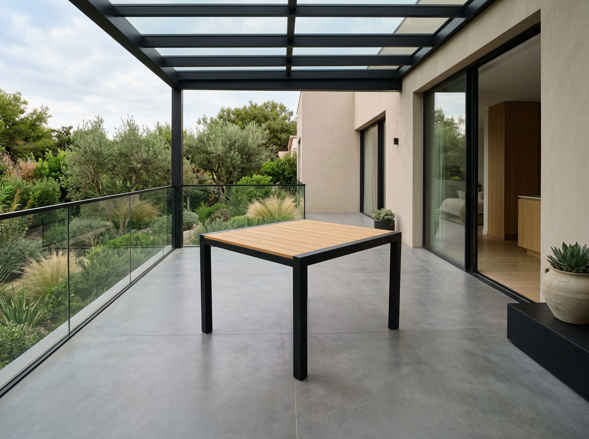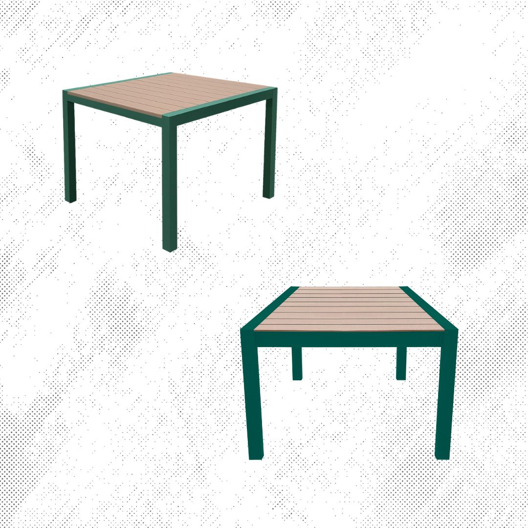 Materiales: Mesa cuadrada para 4 sillas,con una base de aluminio y una cubierta con tablas de polywood, con una capa de pintura electrostática para mayor resistencia, en una gran variedad de colores.