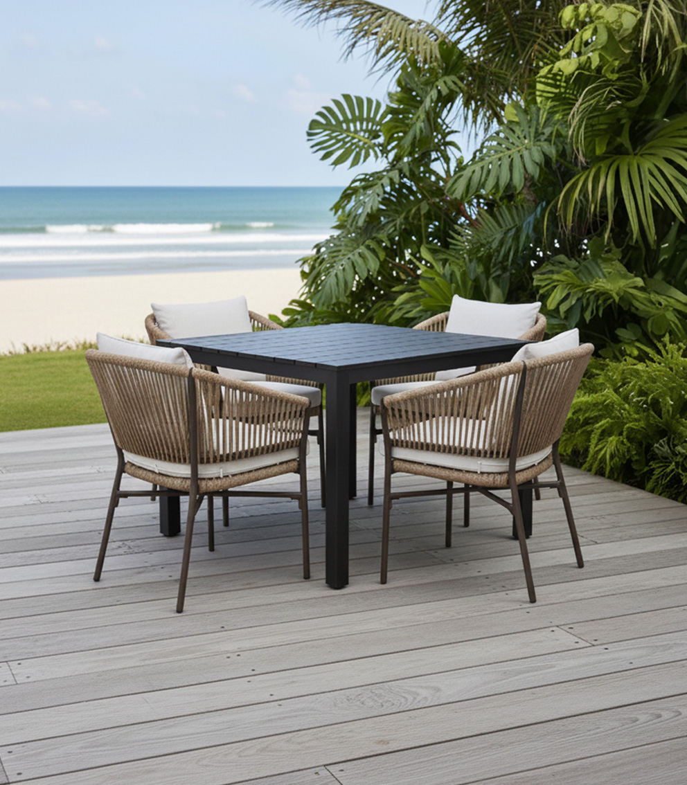 Mesa para 4 sillas, fabricada con cubierta de madera y una base de acero cubierta con pintura electrostática para mayor resistencia a los elementos.