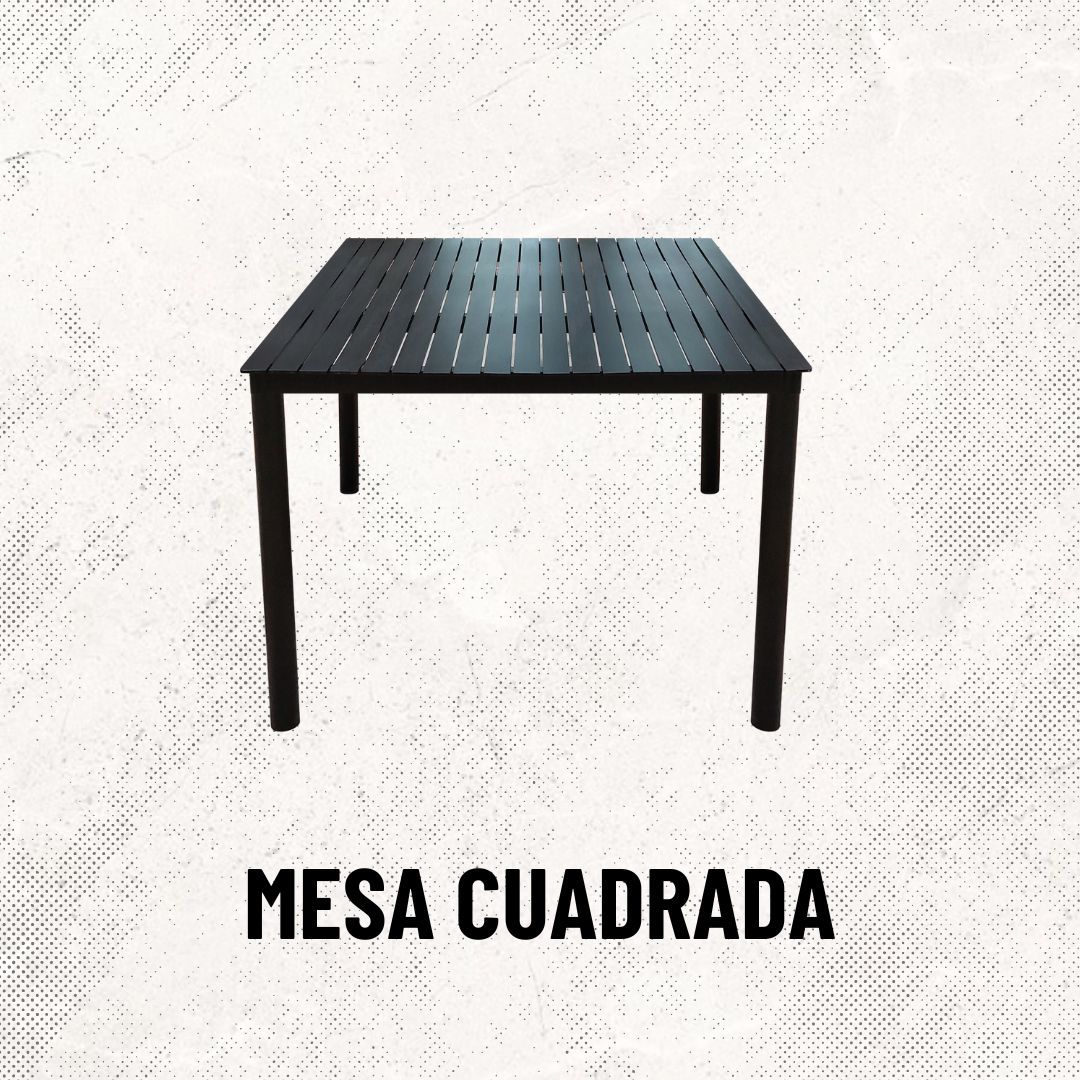 Mesa cuadrada para 4 sillas, fabricada con estructura y una cubierta de acero y una capa de pintura electrostática para mayor resistencia, en una gran variedad de colores.