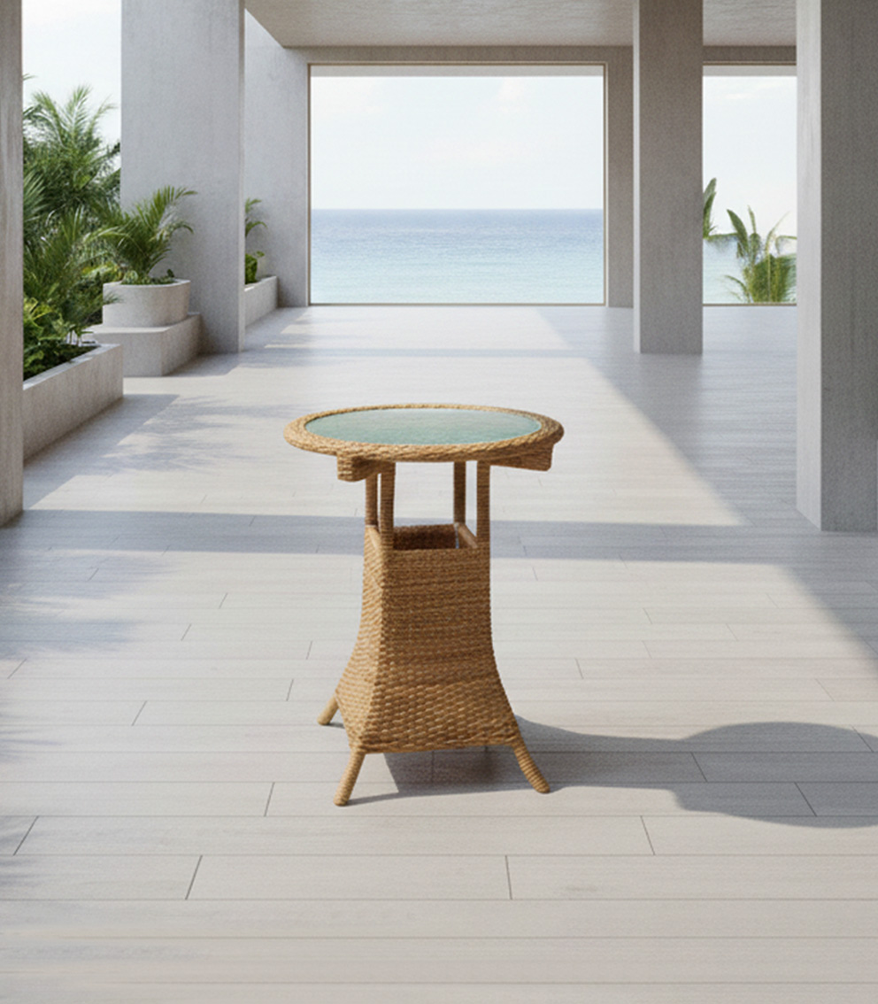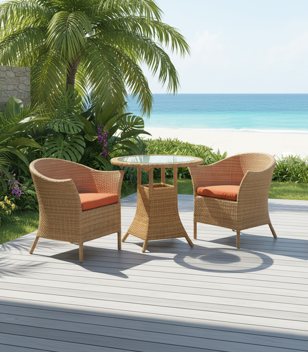 Materiales: Mesa redonda para 2 sillas, con cubierta de cristal, estructura de aluminio tejida con rejilla sintética de alta calidad.