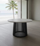 Materiales: Mesa circular con cubierta de piedra y base de madera, en una gran variedad de materiales.