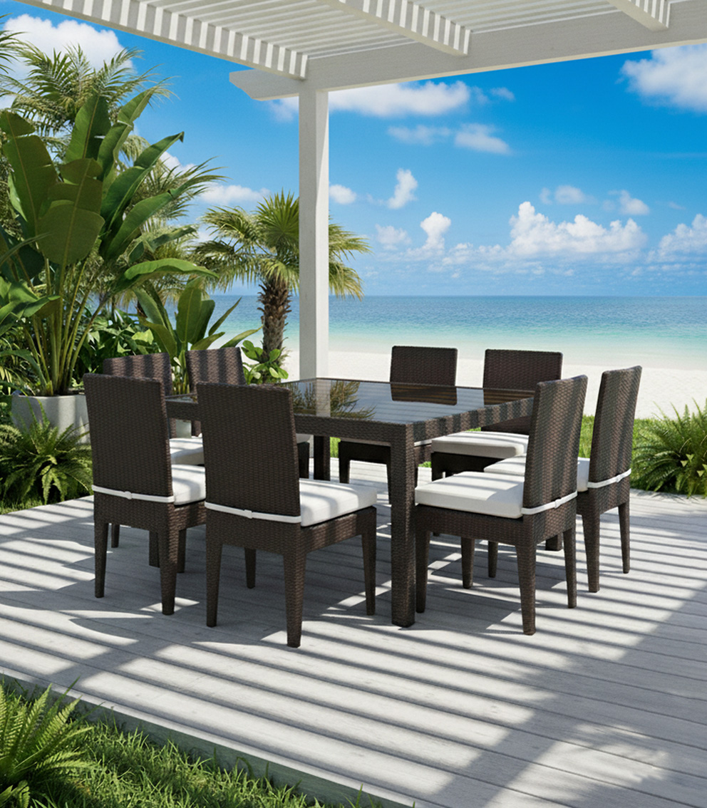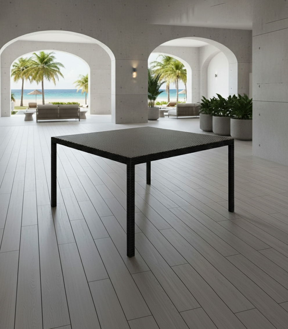 Materiales: Mesa cuadrada para 8 sillas, con estructura de aluminio tejida con rejilla sintética de alta calidad.