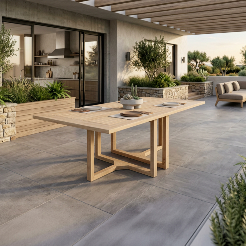 Materiales: Mesa para 4 sillas, fabricada con estructura de aluminio y cubierta de madera.