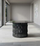 Materiales: Mesa circular con cubierta de piedra y base de madera, en una gran variedad de materiales.