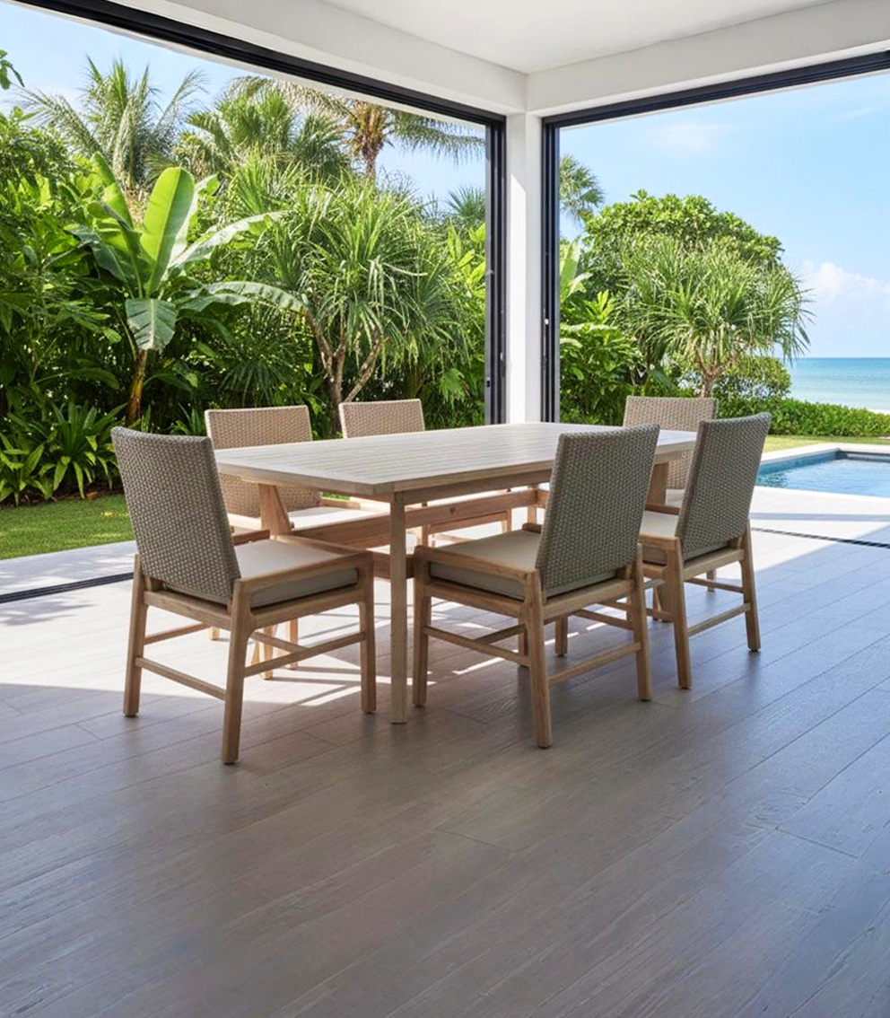 Materiales: Mesa rectangular para 6 sillas, con cubierta de cristal, estructura de aluminio tejida con rejilla sintética de alta calidad.
