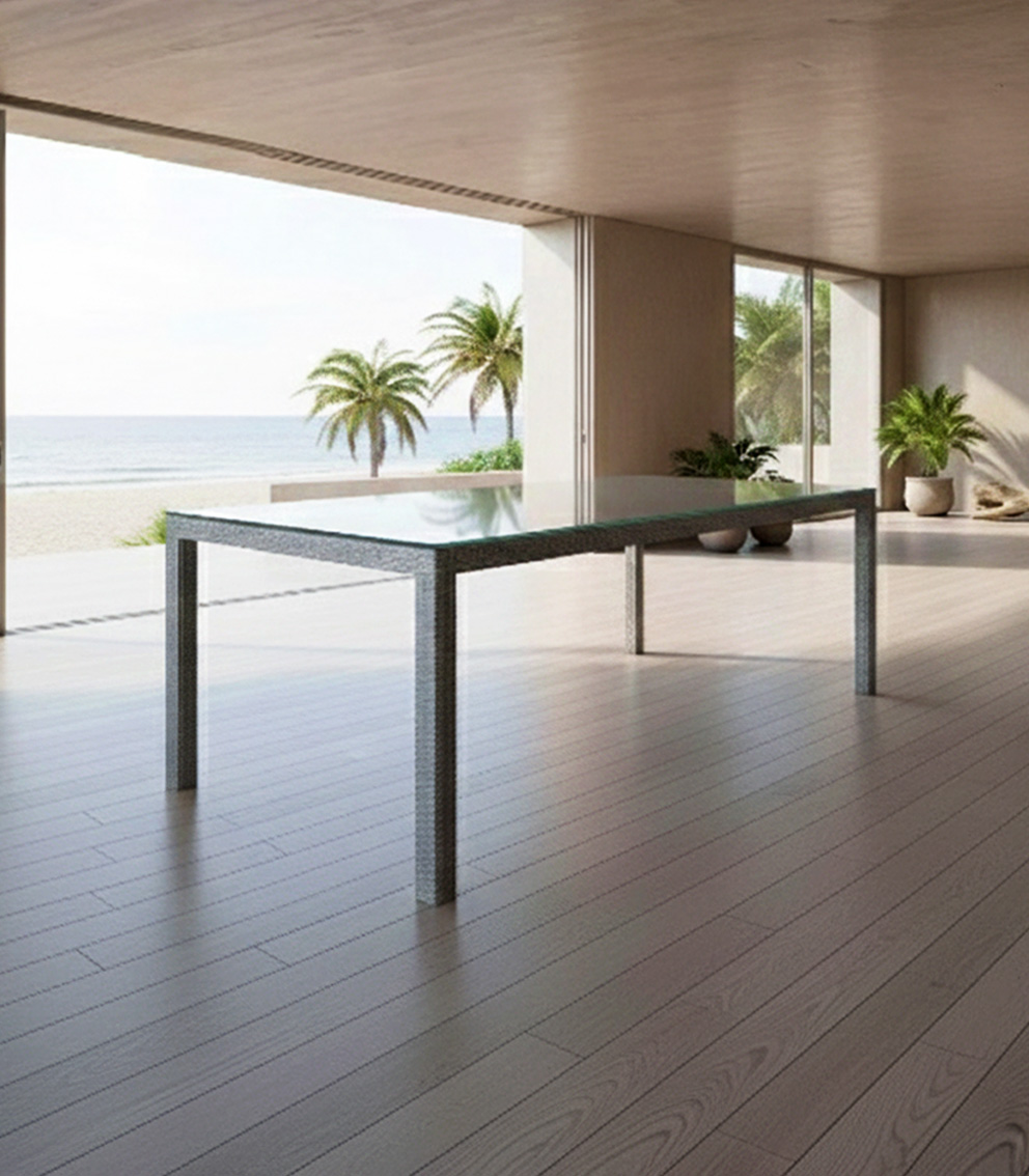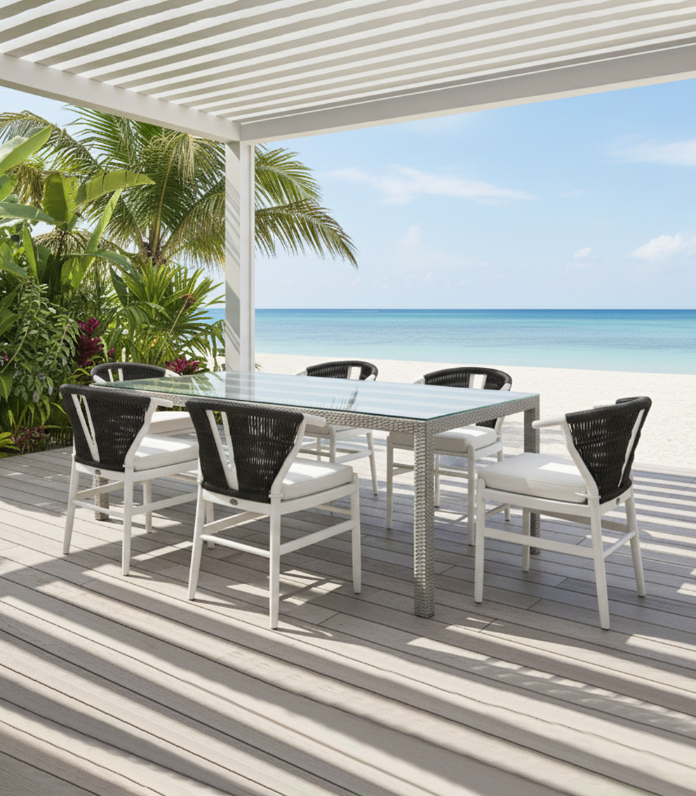 Materiales: Mesa rectangular para 6 sillas, con cubierta de cristal, estructura de aluminio tejida con rejilla sintética de alta calidad.