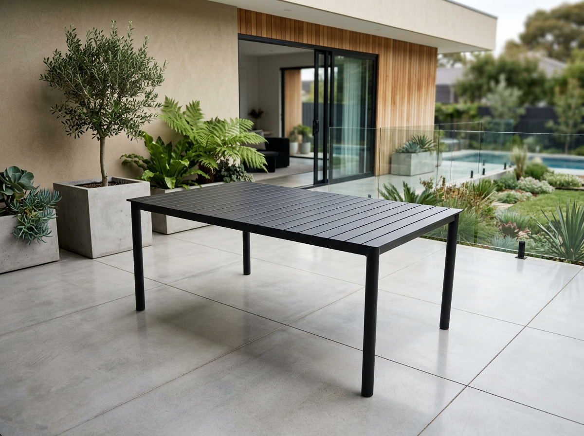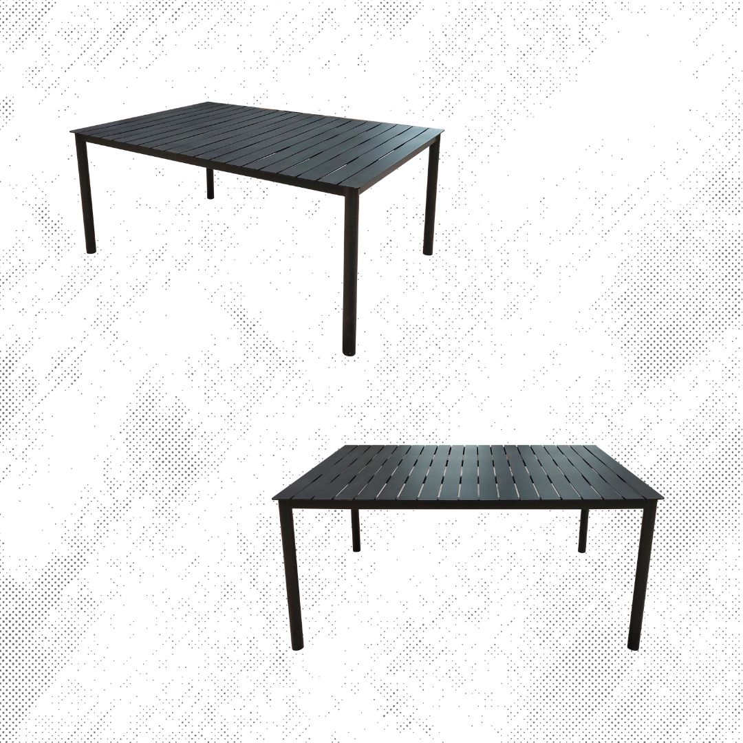 Materiales: Mesa rectangular para 6 sillas, con una base de aluminio y una cubierta con tablas de polywood, con una capa de pintura electrostática para mayor resistencia, en una gran variedad de colores.