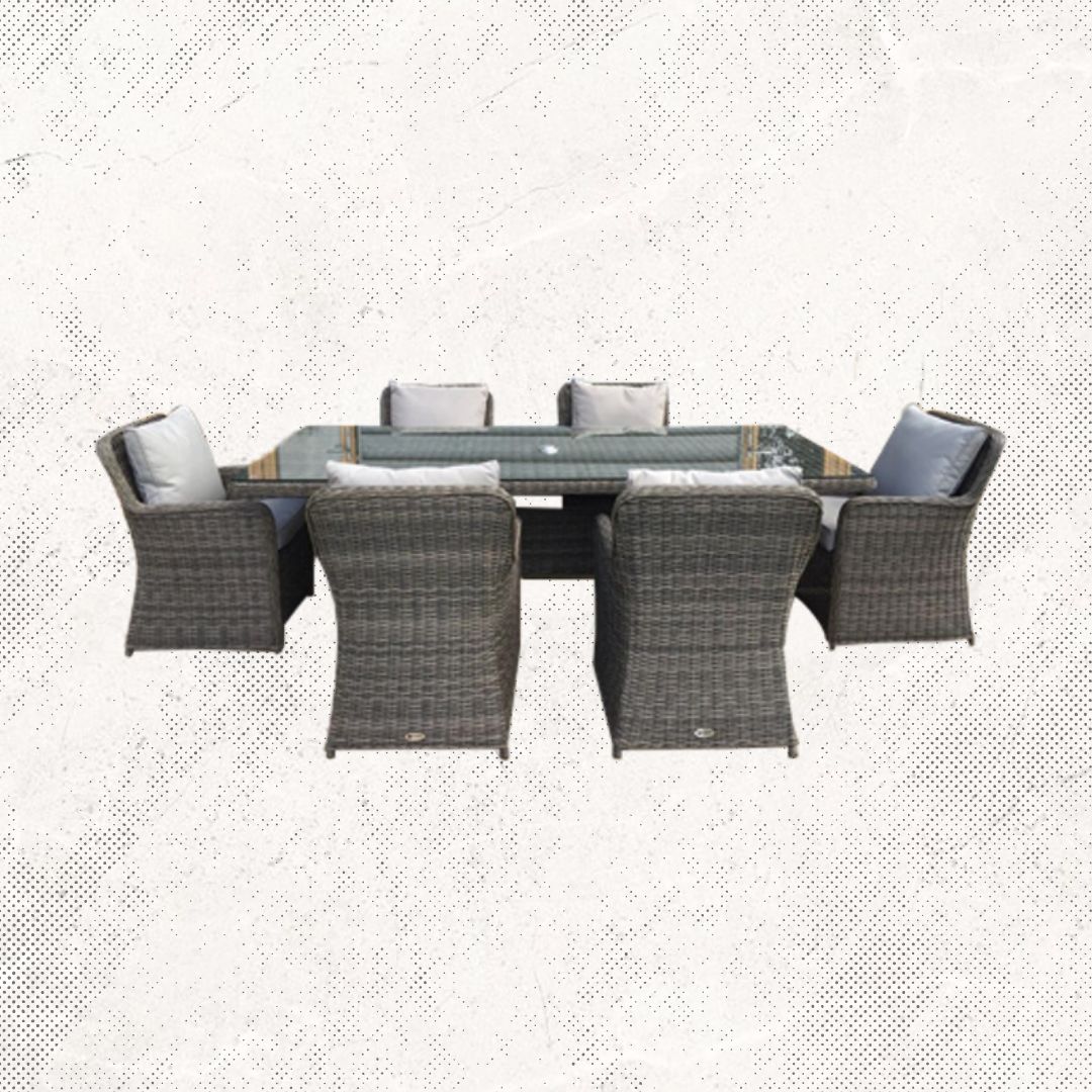 Materiales: Mesa rectangular con estructura de aluminio tejida con rejilla sintética y una cubierta de cristal templado, 6 sillas modelo Mazatlán tejidas con rejilla sintética, cojineria en tela resistente al sol y la intemperie.