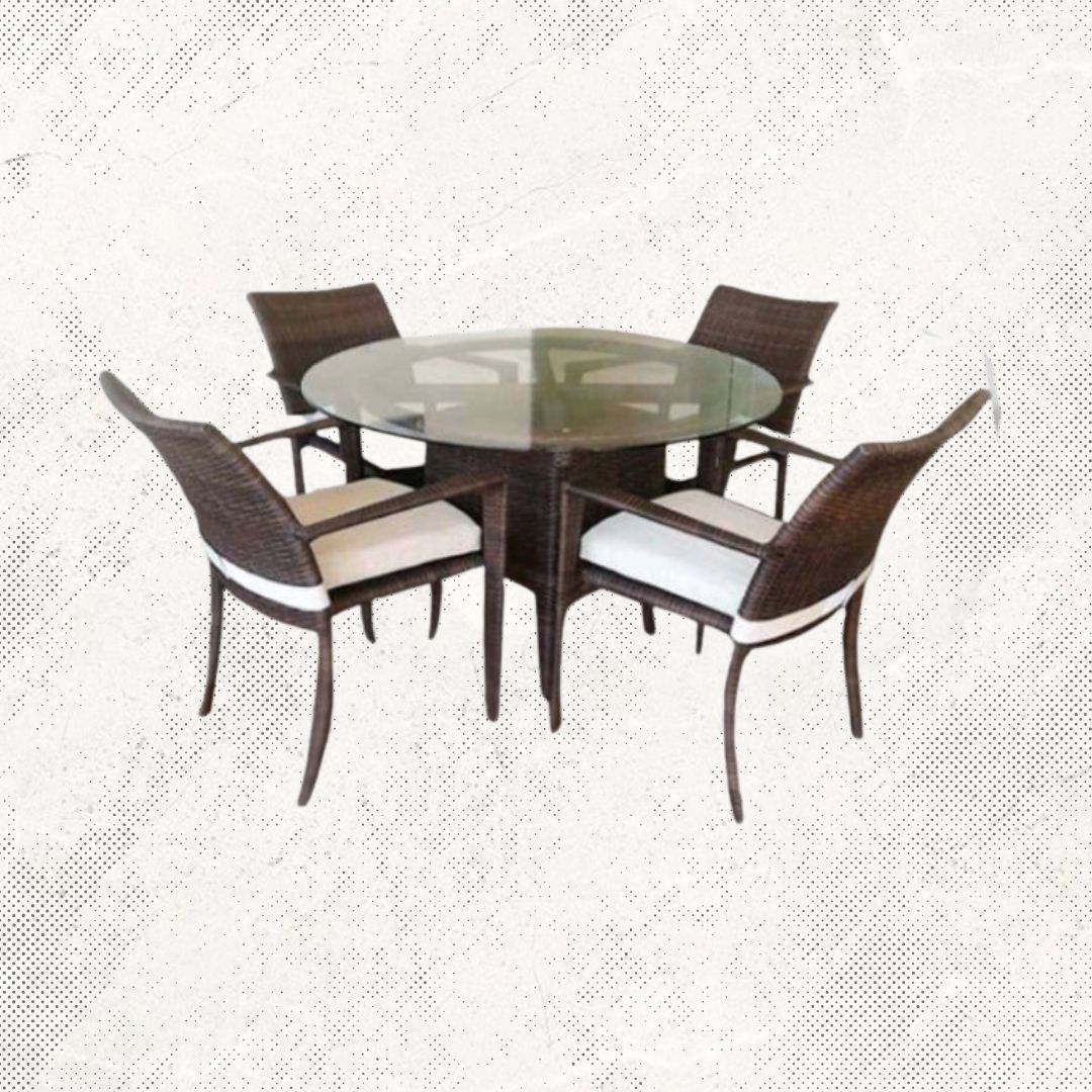 Materiales: Mesa circular con estructura de aluminio tejida con rejilla sintética y una cubierta de cristal templado, 4 sillas modelo Palapa tejidas con rejilla sintética, cojineria en tela resistente al sol y la intemperie.