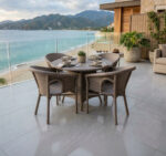 Materiales: Mesa redonda con estructura y cubierta de madera de teca y 4 sillas modelo Victoria, tejidas con rejilla sintético y una base de madera de teca, cojines en tela resistente al sol y la intemperie.