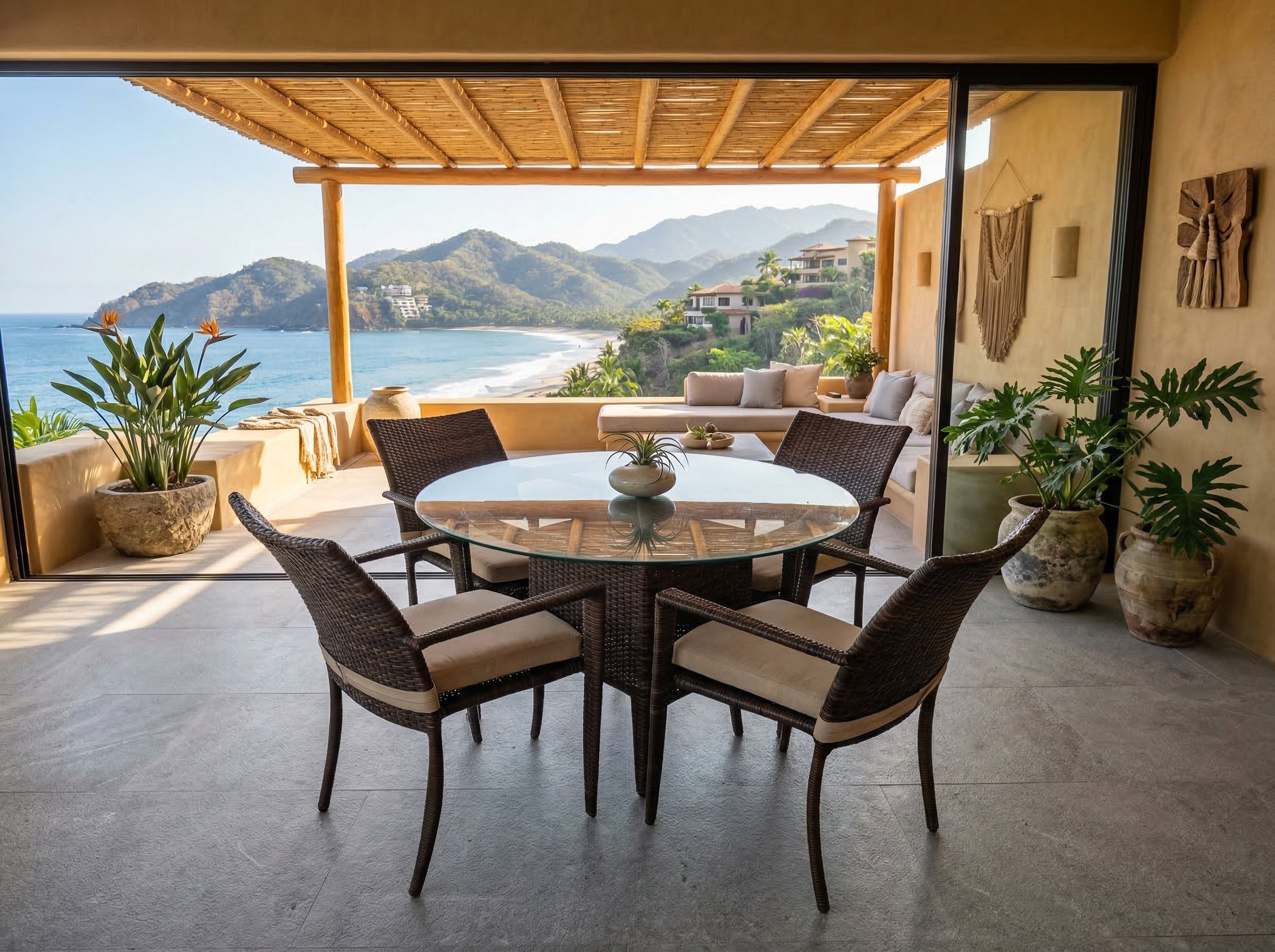 Materiales: Comedor con estructura de madera y detalles tejidos con rejilla sintética de alta calidad, cojinería fabricada con hule espuma de alta densidad y tela resistente al sol y la intemperie.