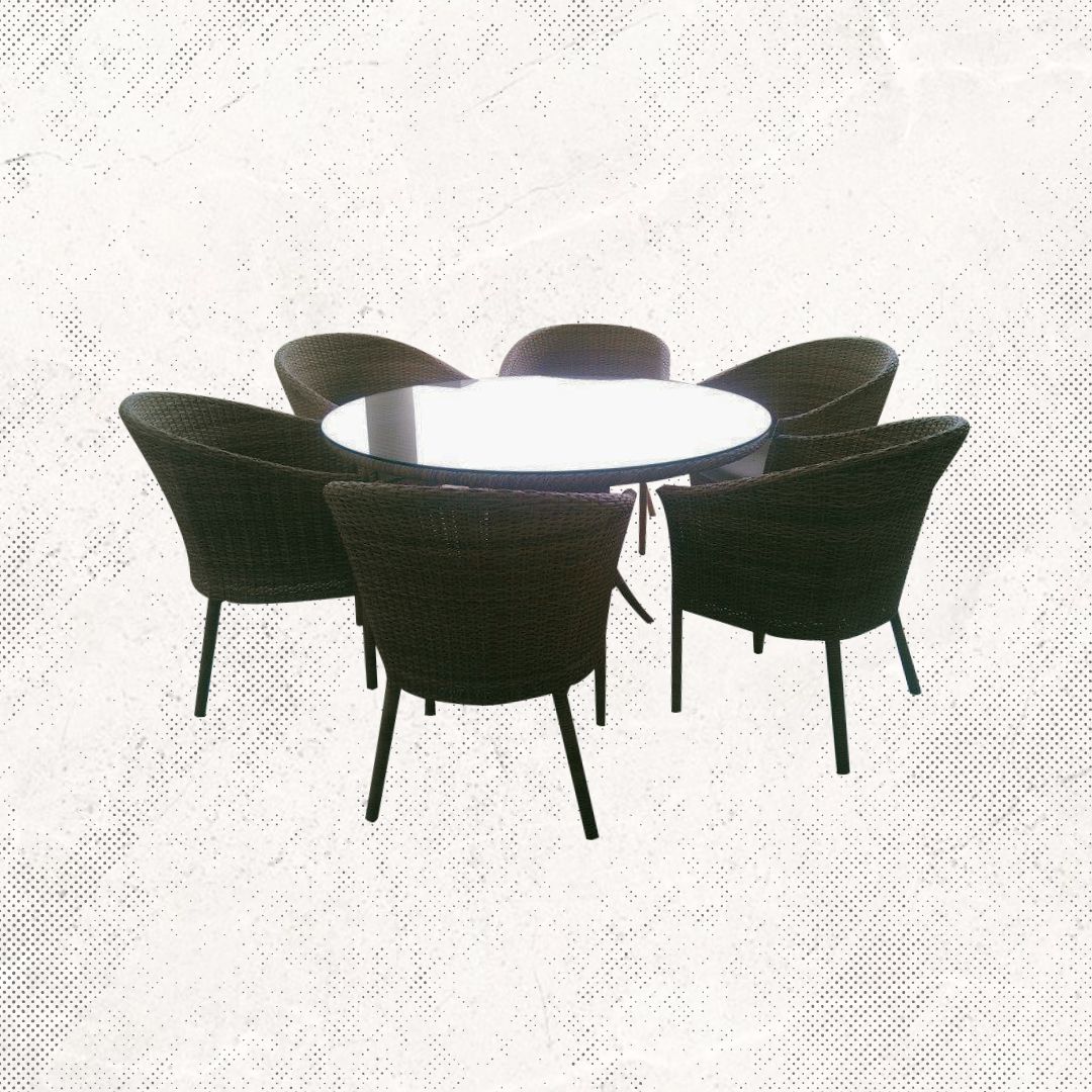 Materiales: Mesa rectangular con estructura de aluminio tejida con rejilla sintética y una cubierta de cristal templado, 6 sillas modelo Alicia tejidas con rejilla sintética, cojineria fabricada con espuma de alta densidad, tela resistente al sol y la intemperie.
