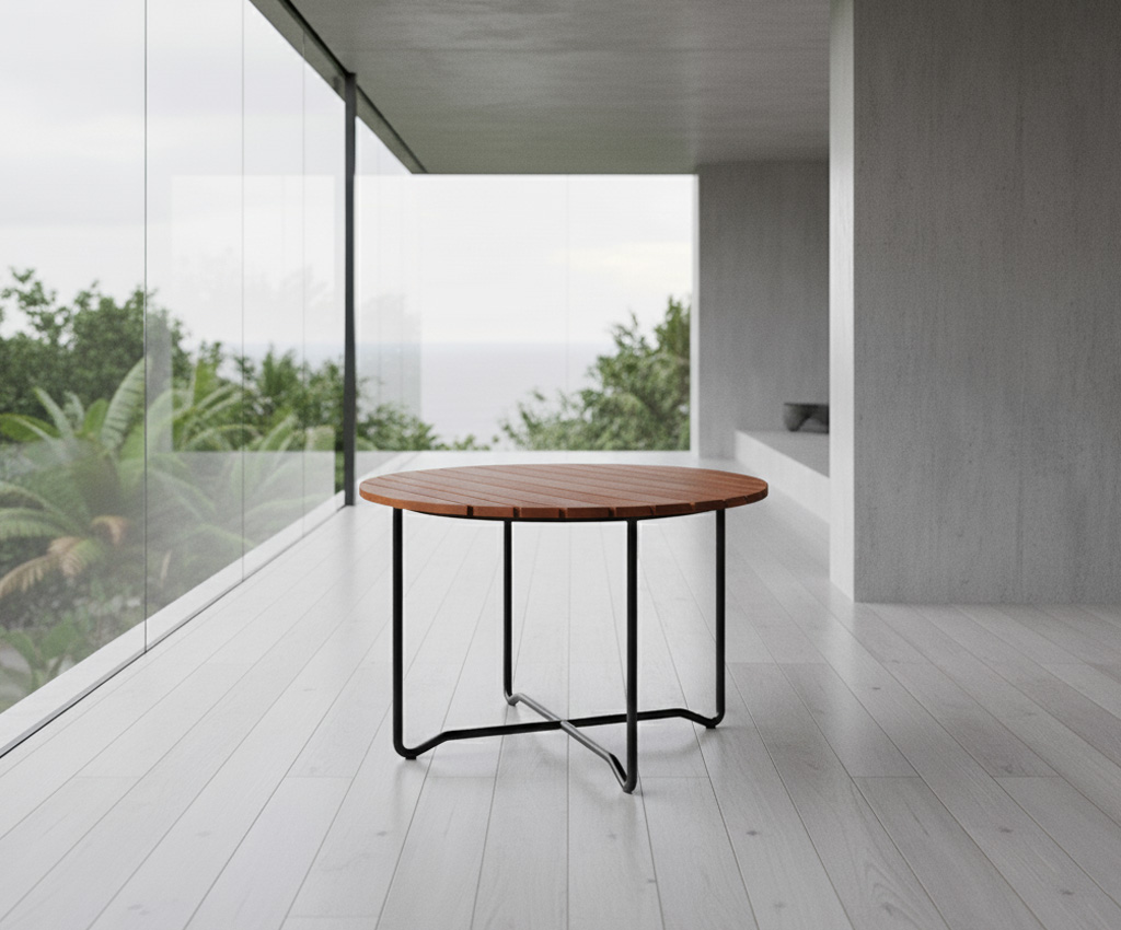 Materiales: Mesa circular con cubierta y base de madera, en una gran variedad de materiales.