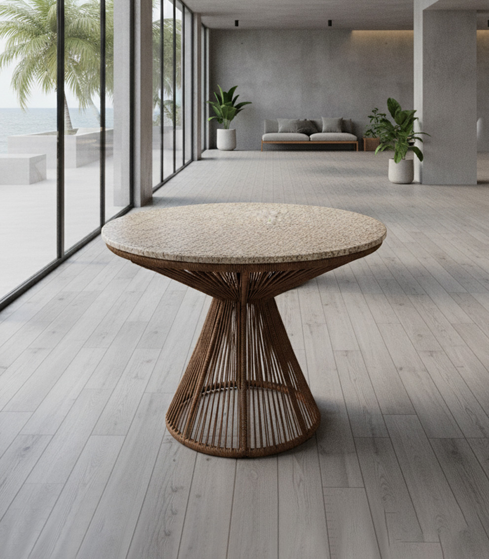 Materiales: Mesa circular con cubierta de piedra y base de madera, en una gran variedad de materiales.
