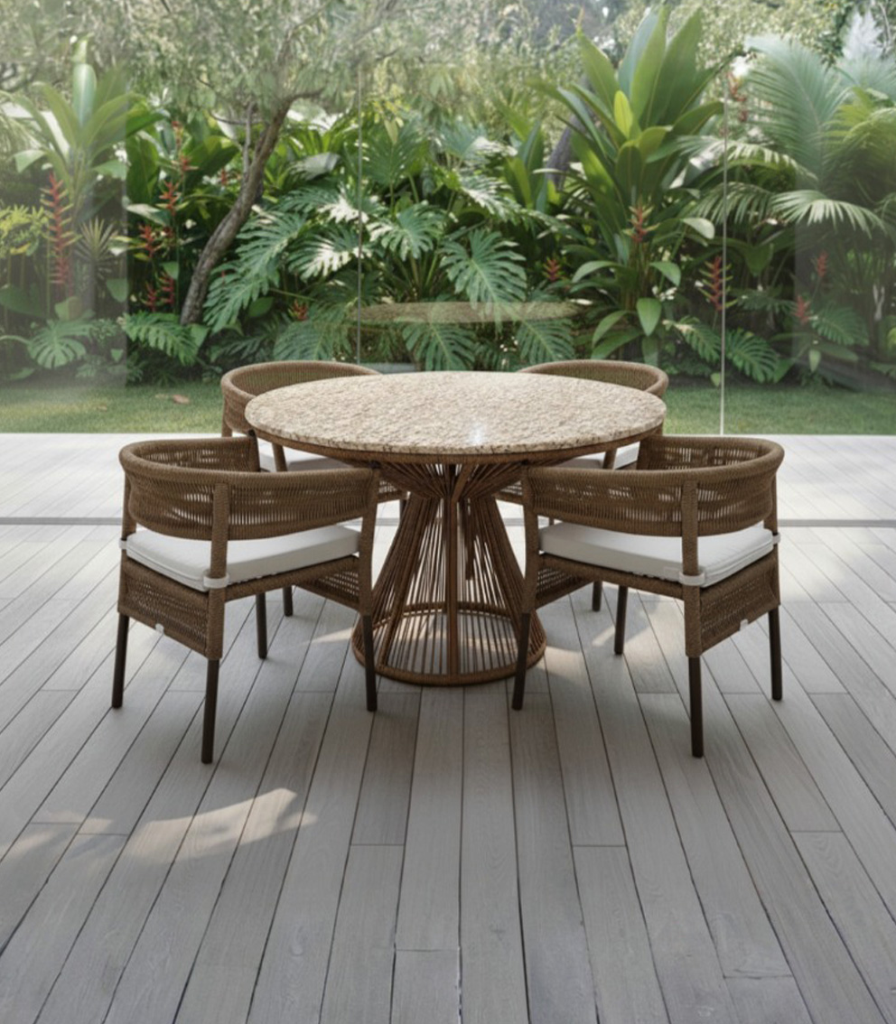 Materiales: Mesa redonda para 4 sillas, con cubierta de piedra, estructura de aluminio tejida con rejilla sintética de alta calidad.