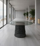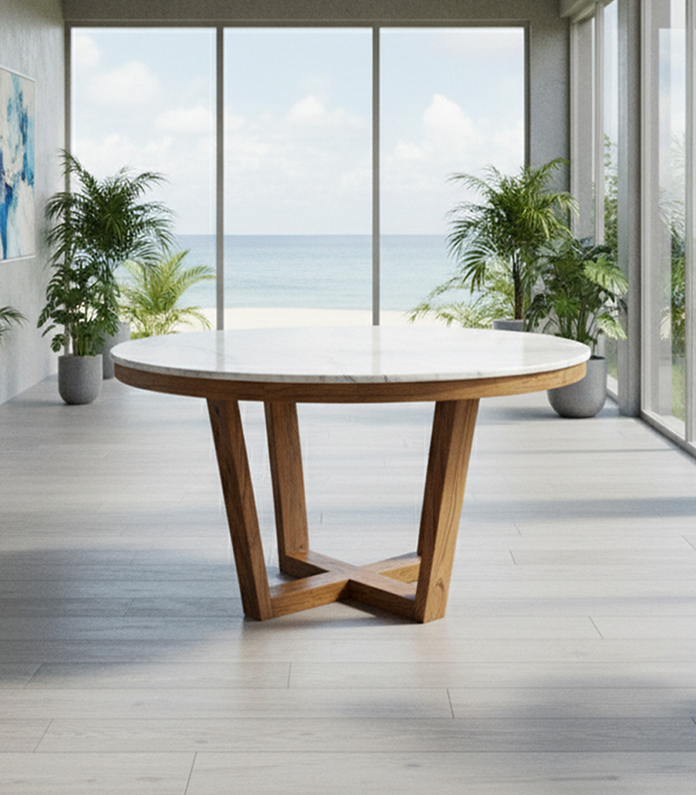 Materiales: Mesa circular con cubierta de piedra y base de madera, en una gran variedad de materiales.