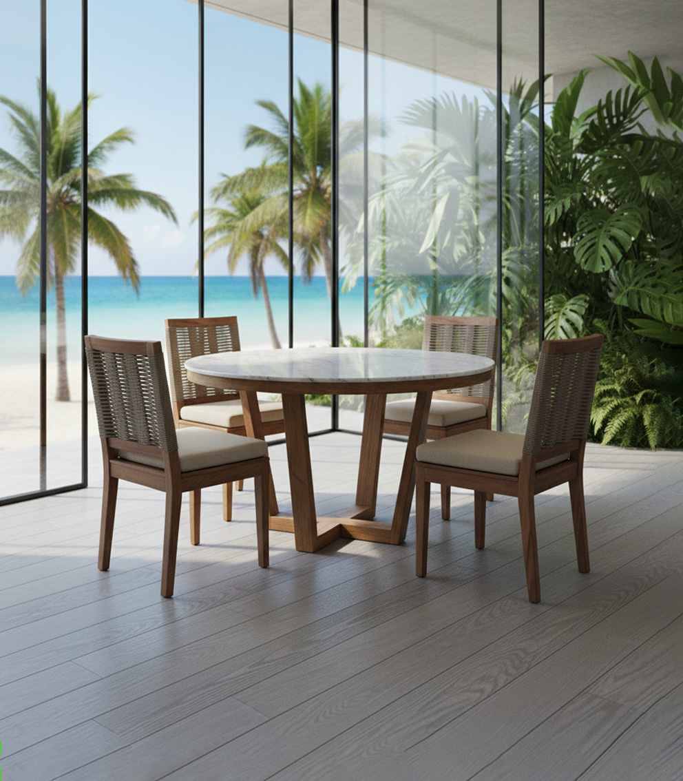 Materiales: Mesa para 4 sillas, fabricada con estructura de aluminio y cubierta de madera.