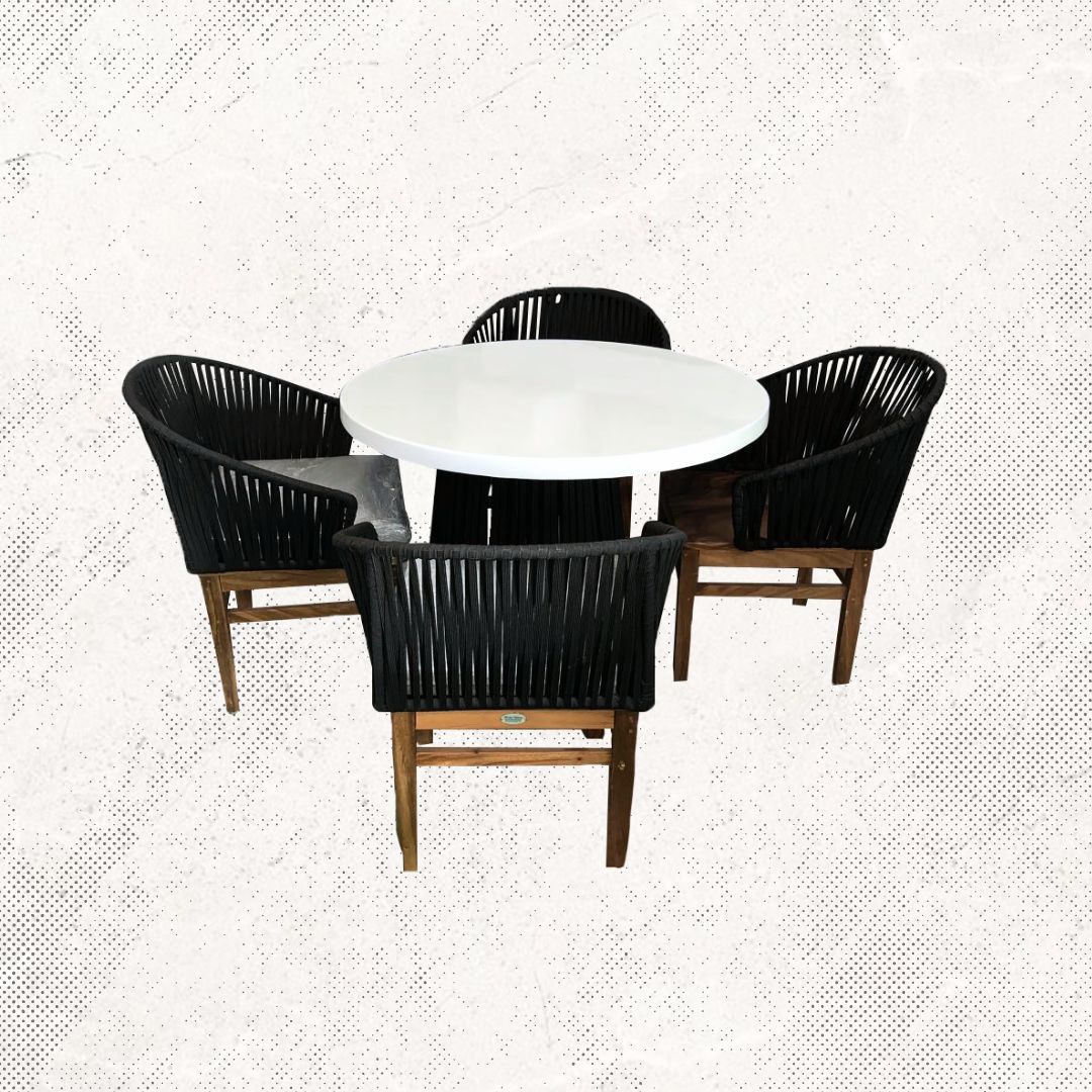 Materiales: Mesa redonda con estructura de madera y una cubierta de marmol , 4 sillas modelo Montreal tejidas con rejilla sintético y una base de madera de parota, cojineria en tela resistente al sol y la intemperie.