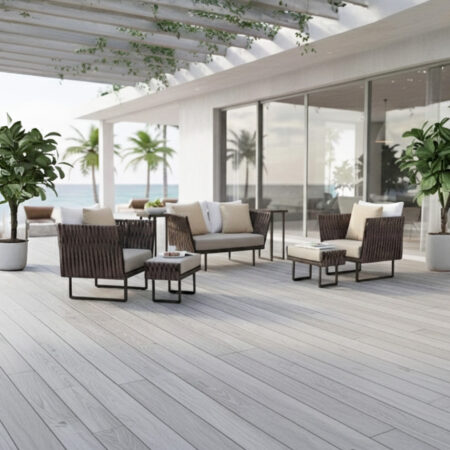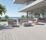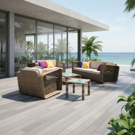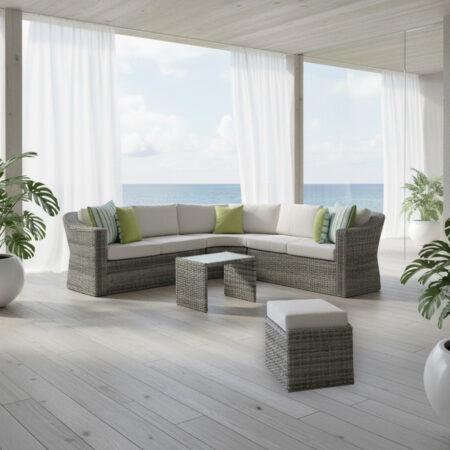 Materiales: Sala con estructura de aluminio, base de madera, tejida con rejilla sintética de alta calidad, cojinería fabricada con hule espuma de alta densidad y tela resistente al sol y la intemperie.