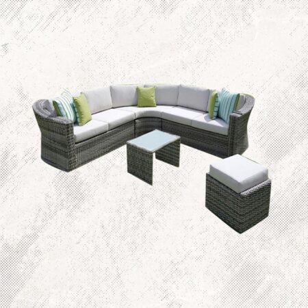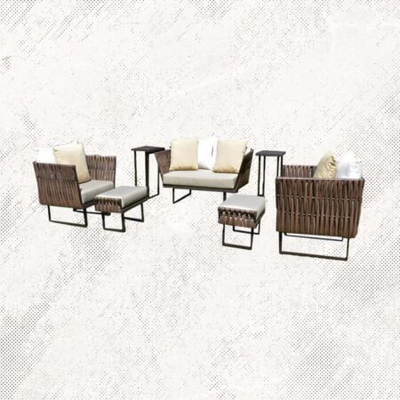 Materiales: Sala con estructura de aluminio, tejida con rejilla sintética de alta calidad, cojinería fabricada con hule espuma de alta densidad y tela resistente al sol y la intemperie.