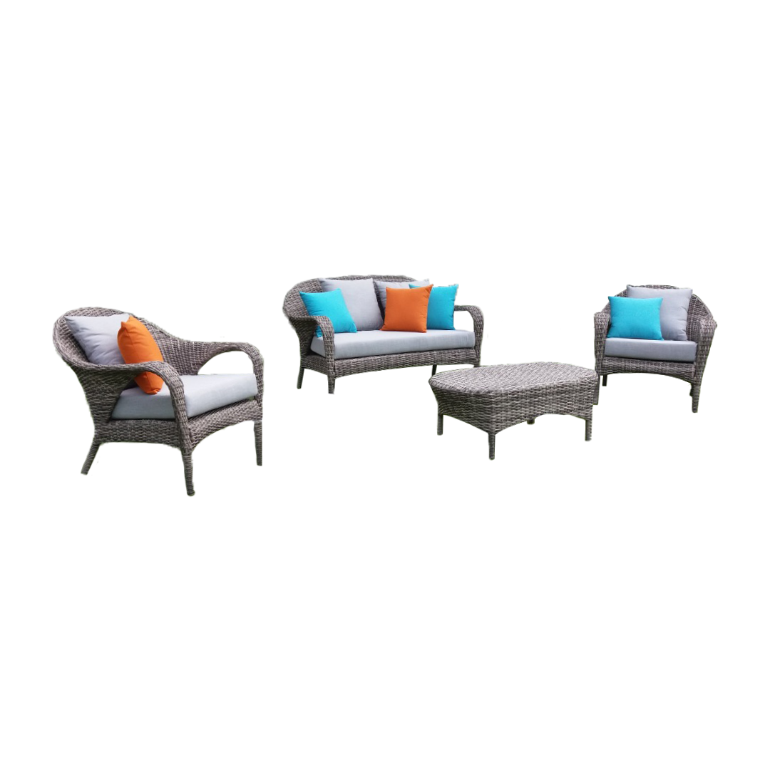 Materiales: Sala con estructura de aluminio, tejida con rejilla sintética de alta calidad, cojinería fabricada con hule espuma de alta densidad y tela resistente al sol y la intemperie.