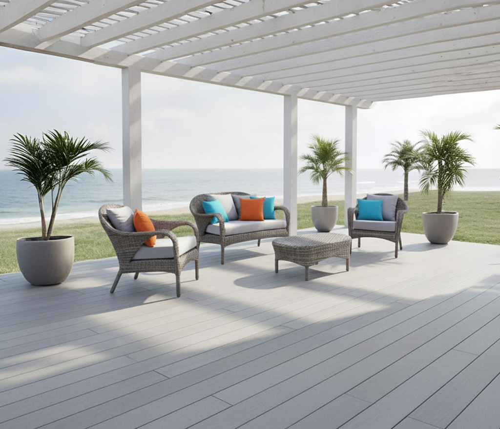 Materiales: Sala con estructura de madera, cojinería fabricada con hule espuma de alta densidad y tela resistente al sol y la intemperie.