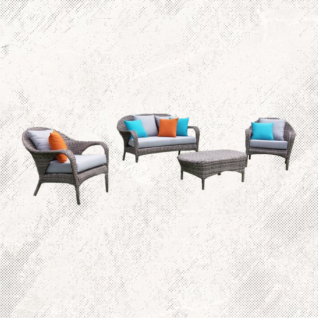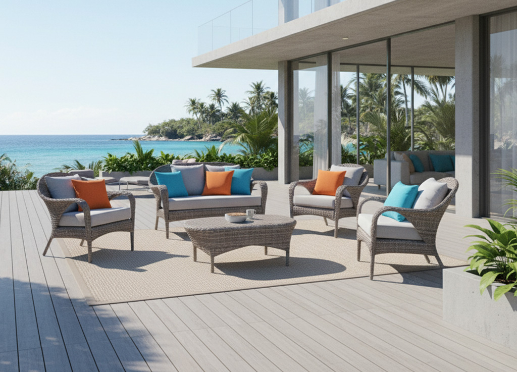 Materiales: Sala con estructura de aluminio, base de madera, tejida con rejilla sintética de alta calidad, cojinería fabricada con hule espuma de alta densidad y tela resistente al sol y la intemperie.
