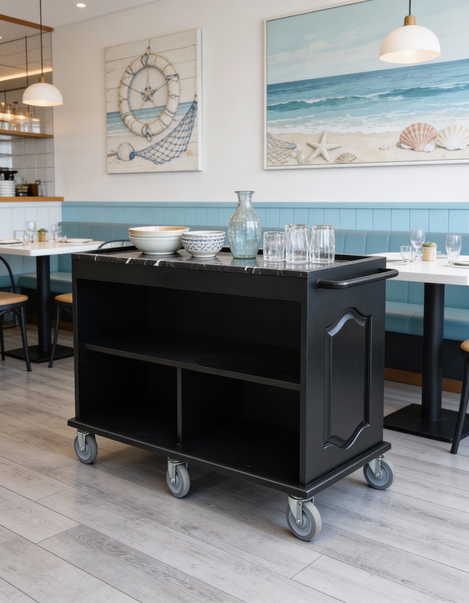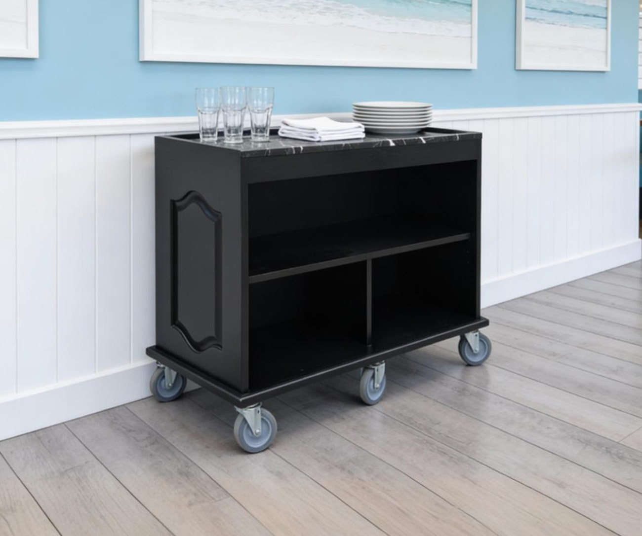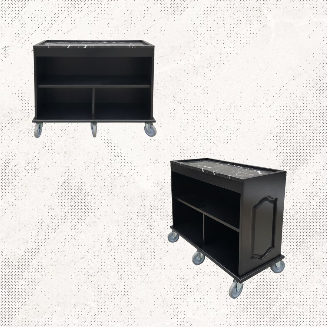 Materiales: Fabricada en madera, con repisas para almacenamiento y llantas para un fácil flujo de los espacios.
