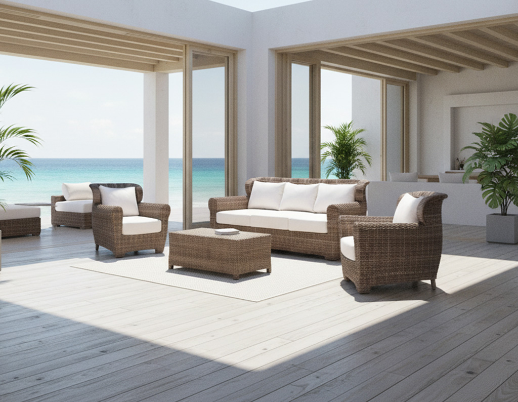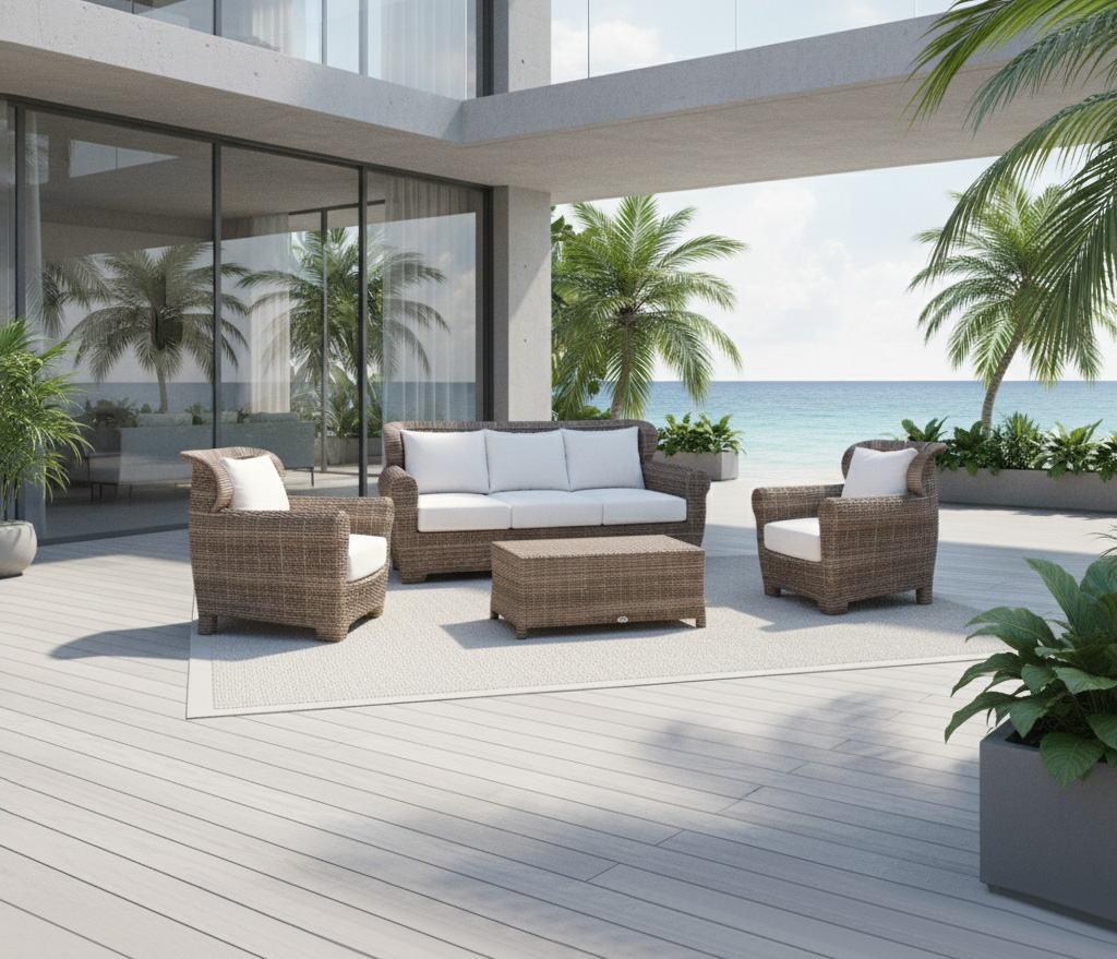 Materiales: Sala con estructura de aluminio, base de madera, tejida con rejilla sintética de alta calidad, cojinería fabricada con hule espuma de alta densidad y tela resistente al sol y la intemperie.