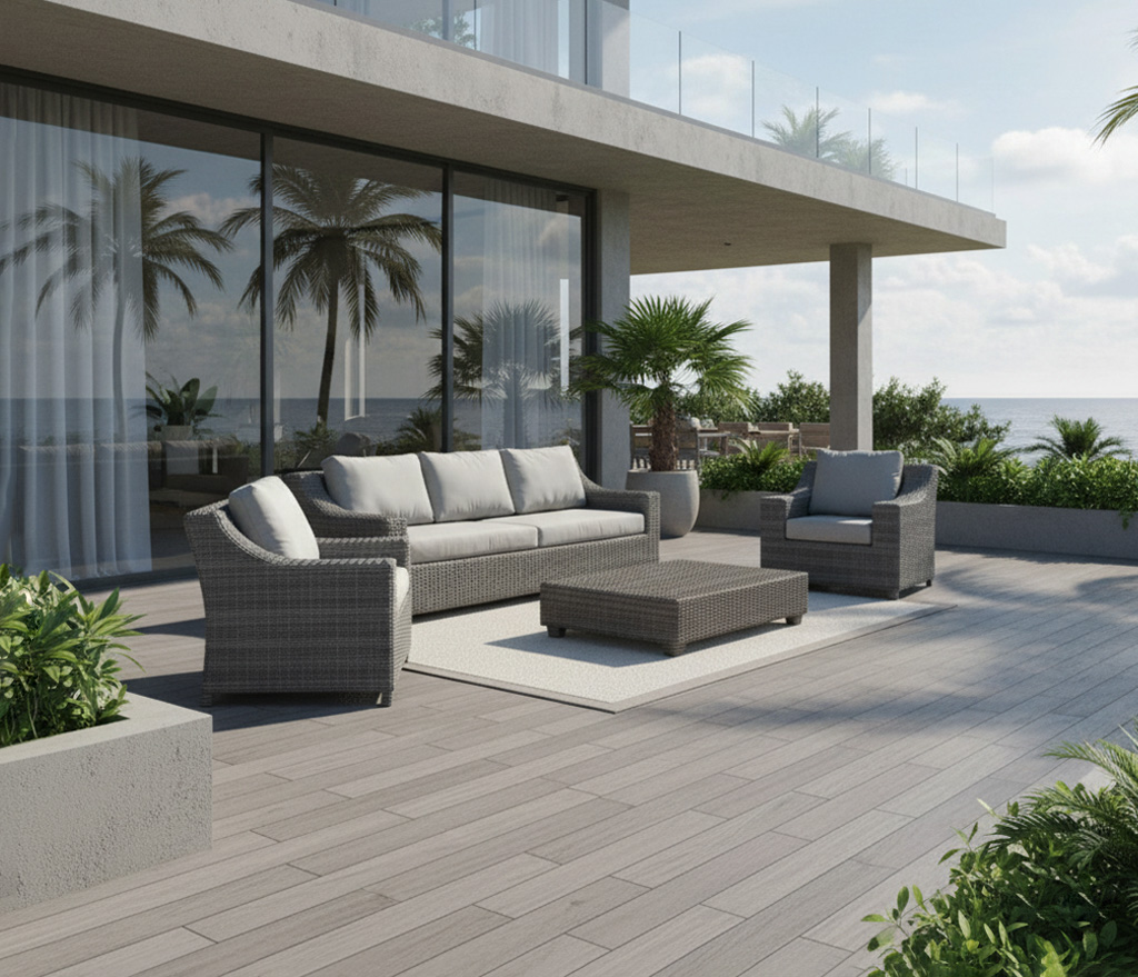 Estructura de aluminio tejida con rattan sintético. Cojines en tela Sumbrella y mesa de centro con cubierta de cristal.