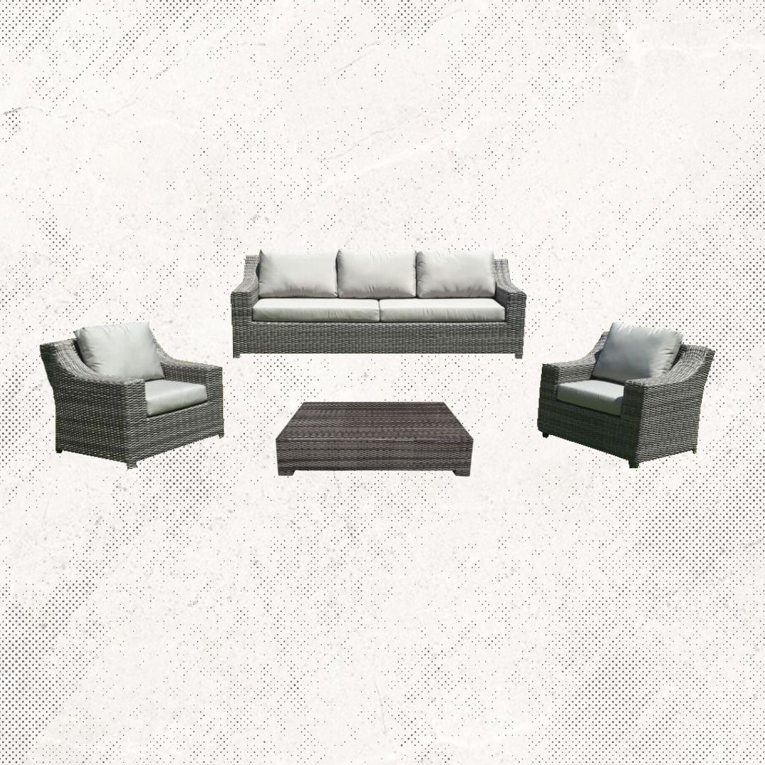 Materiales: Sala con estructura de aluminio, tejida con rejilla sintética de alta calidad, cojinería fabricada con hule espuma de alta densidad y tela resistente al sol y la intemperie.
