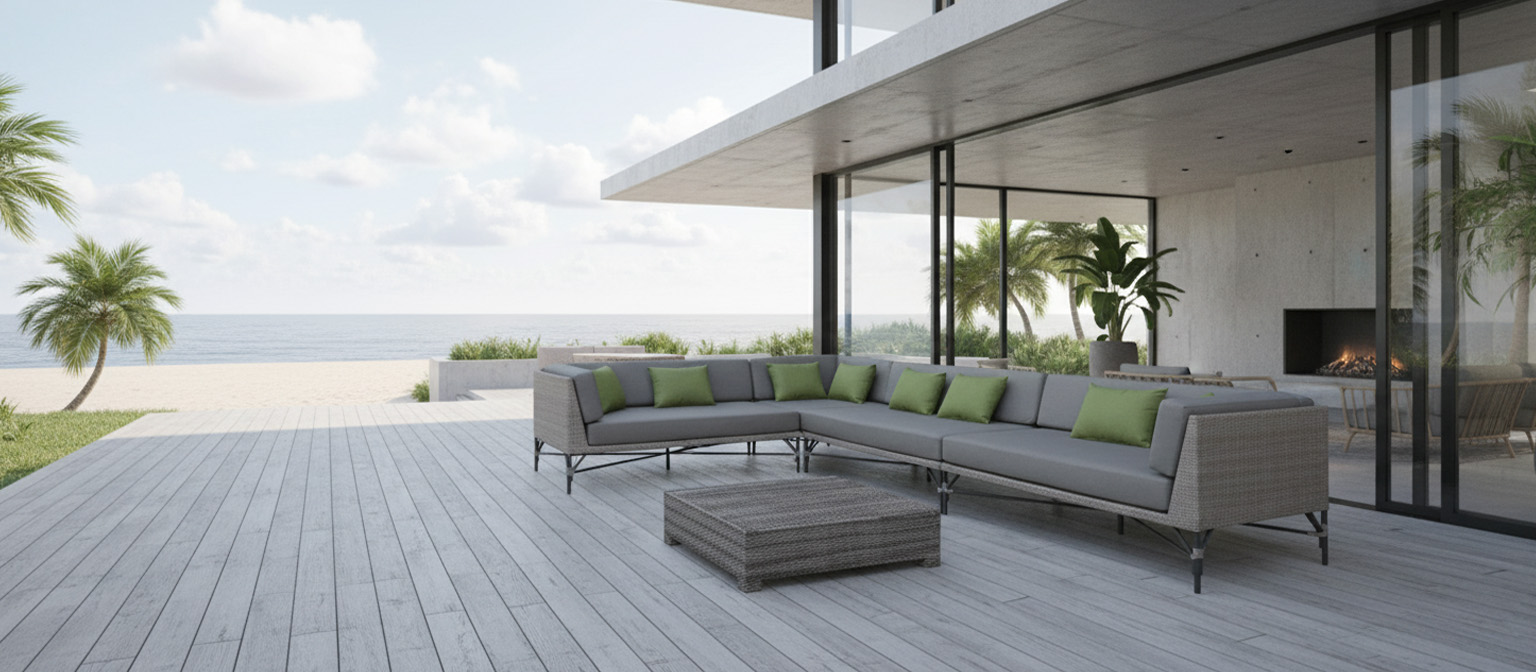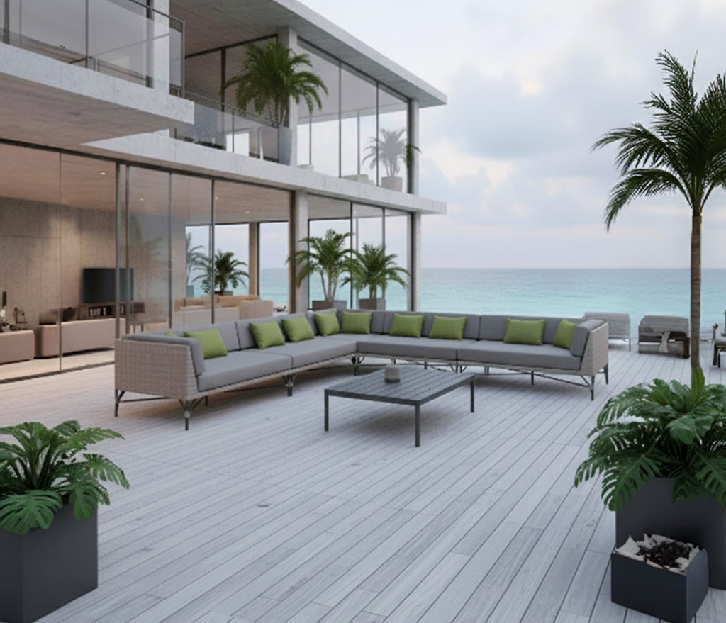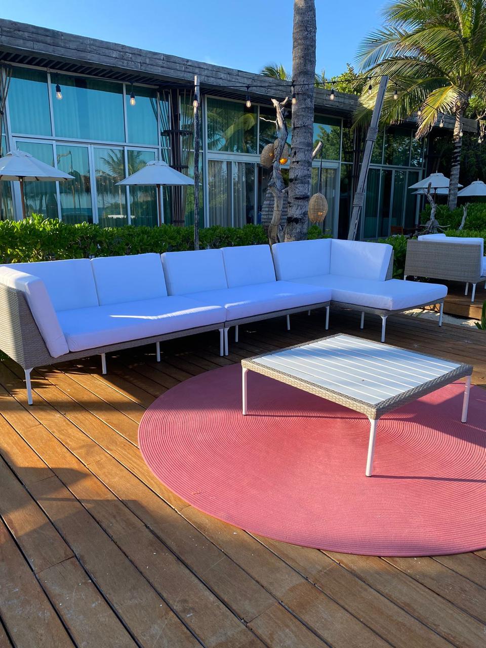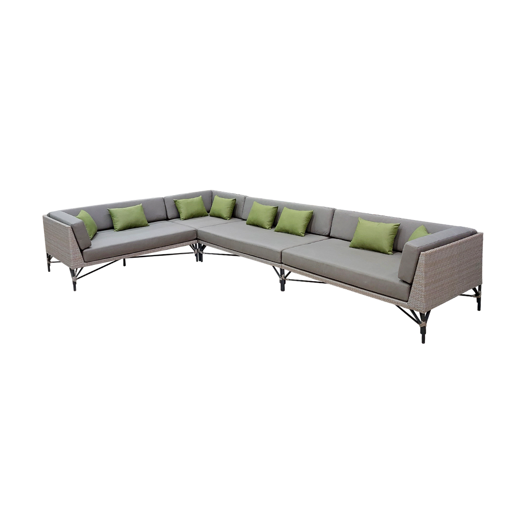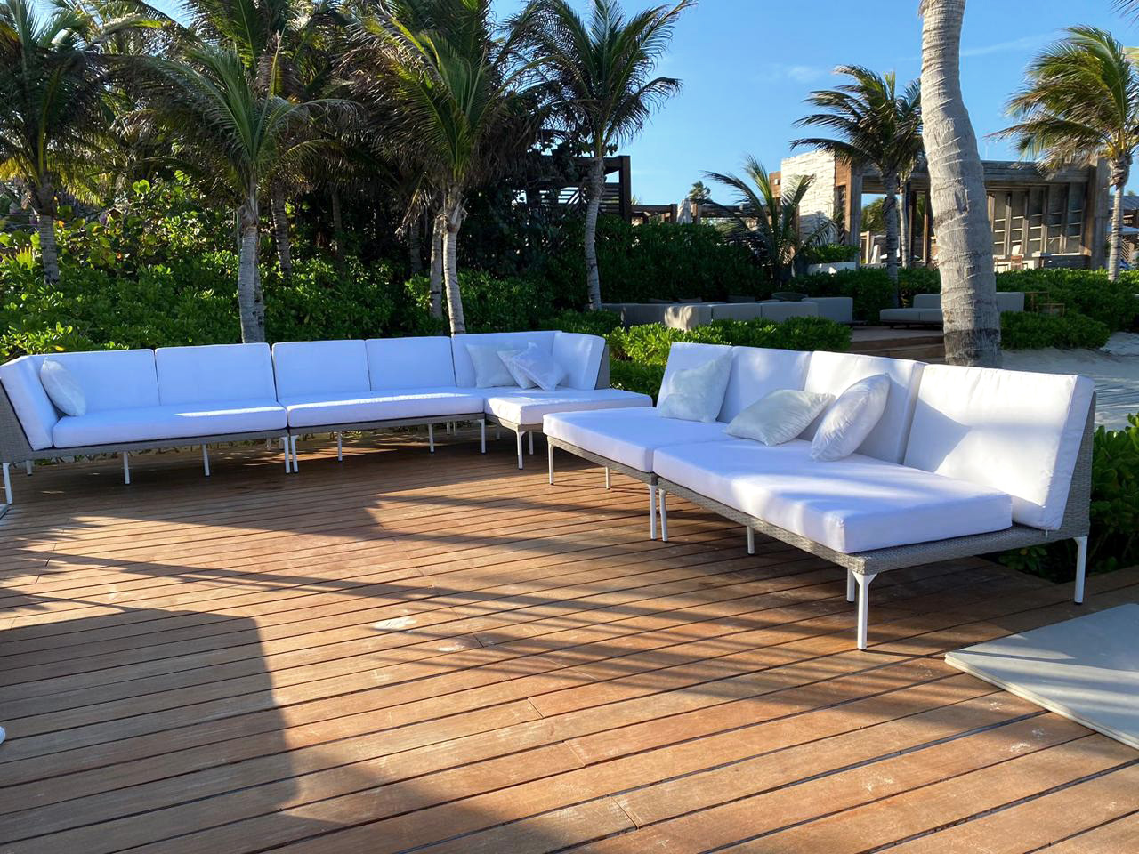 Materiales: Sala con estructura de aluminio, tejida con rejilla sintética de alta calidad, cojinería fabricada con hule espuma de alta densidad y tela resistente al sol y la intemperie.