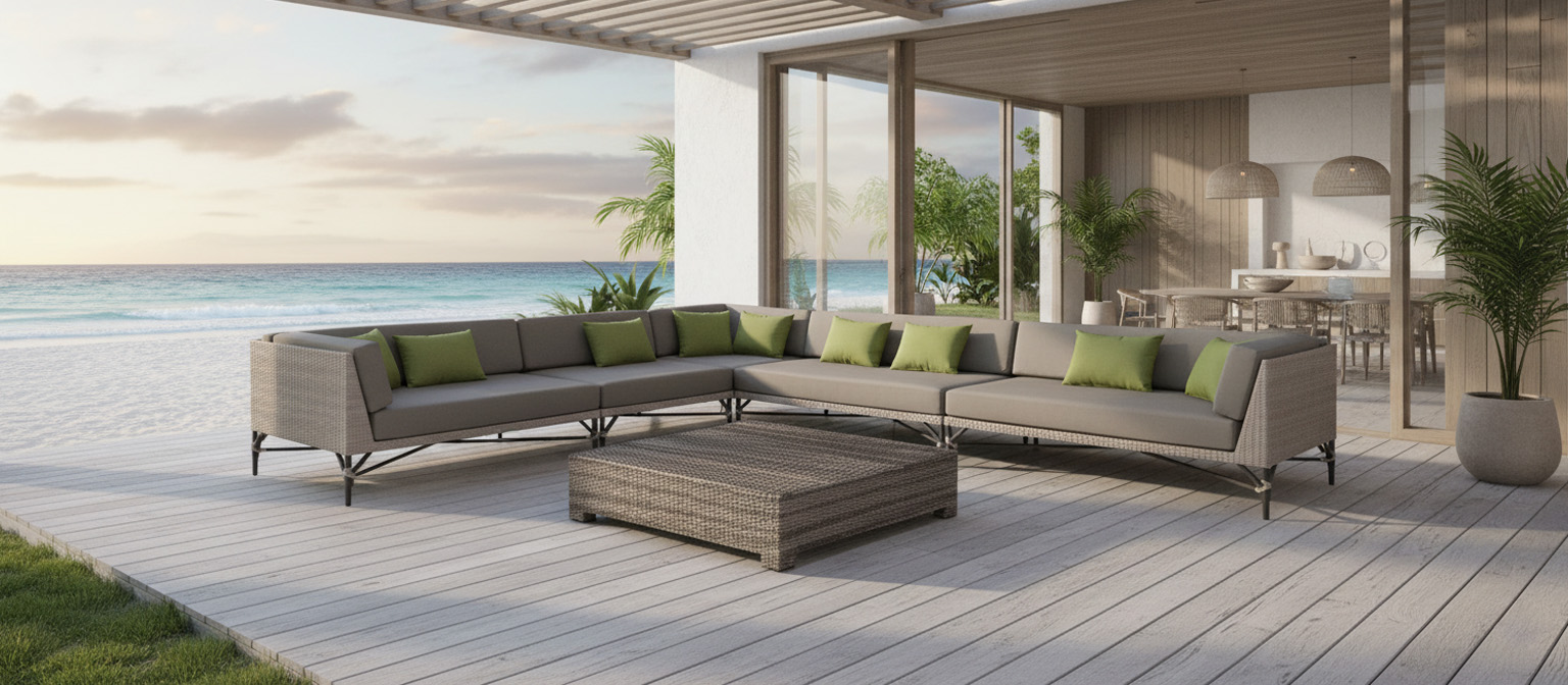 Armazón de aluminio, tejido con rejilla sintética, cojines en tela sumbrella, hule espuma de alta densidad.