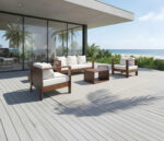 Materiales: Sala con una base de madera, estructura de aluminio tejida con rejilla sintética de alta calidad, cojinería fabricada con hule espuma de alta densidad y tela resistente al sol y la intemperie.