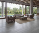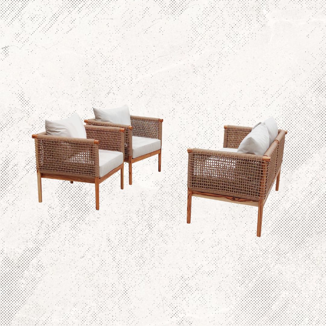 Materiales: Sala con estructura de madera, tejida con rejilla sintética de alta calidad, cojinería fabricada con hule espuma de alta densidad y tela resistente al sol y la intemperie.