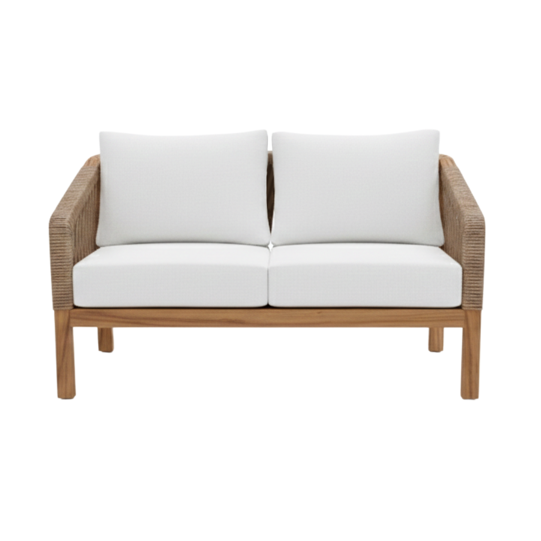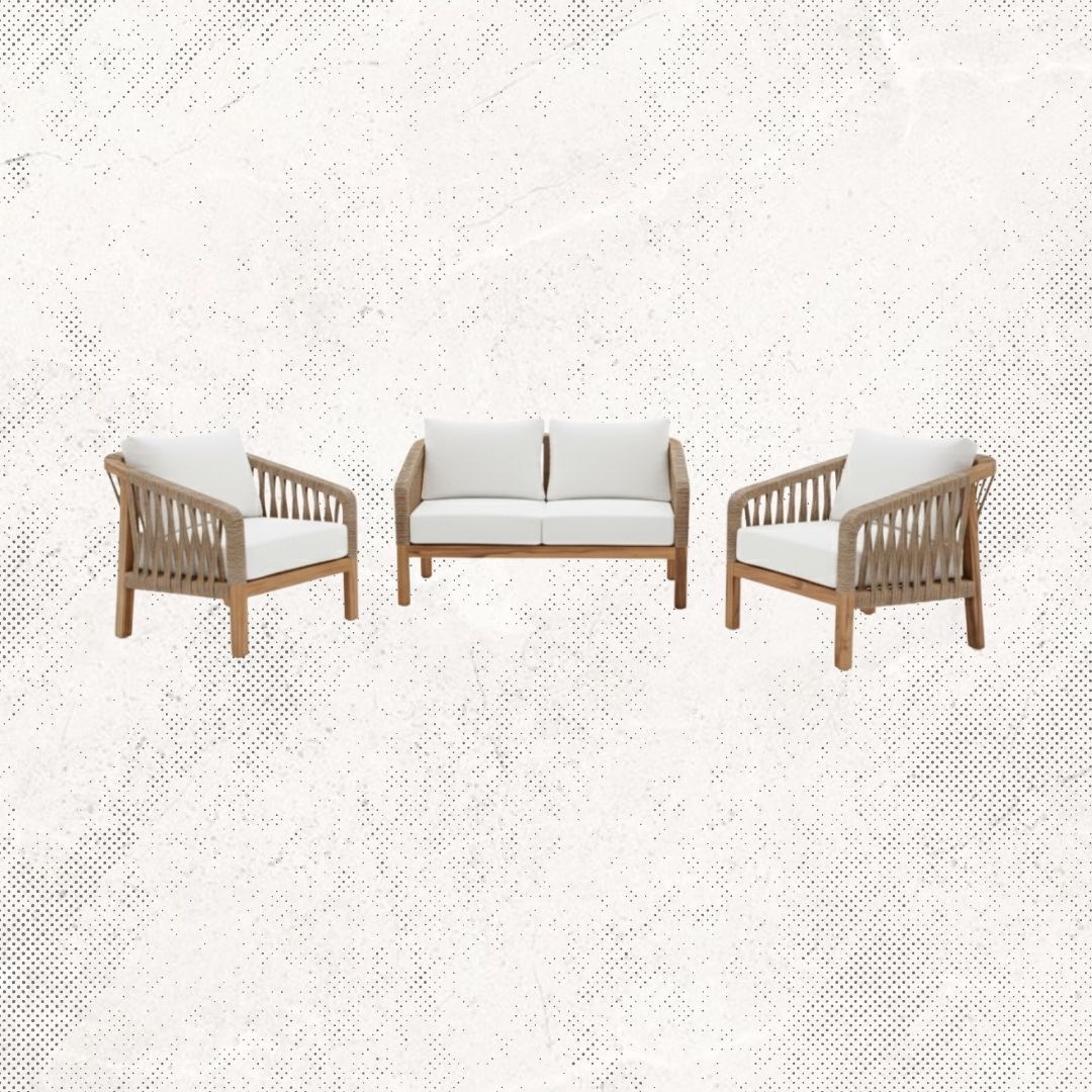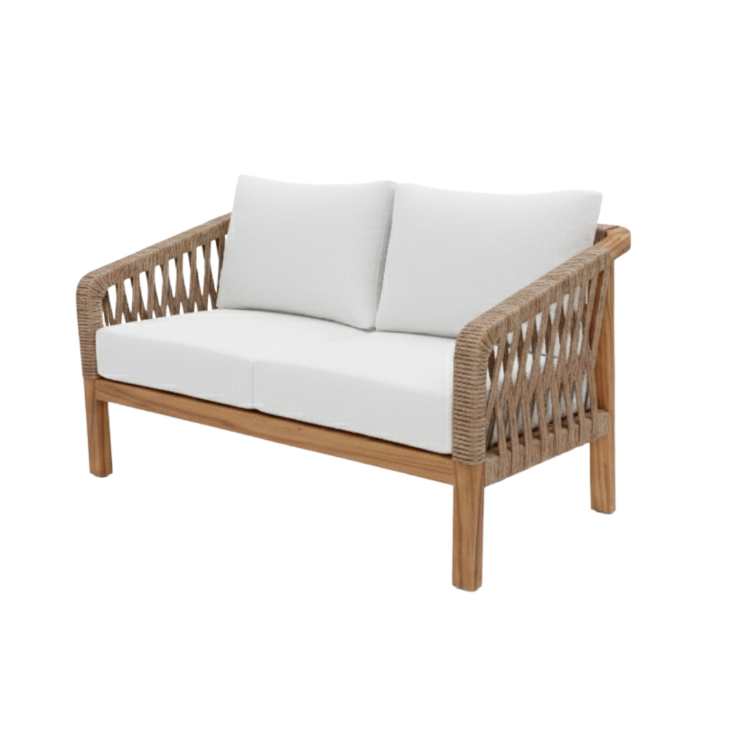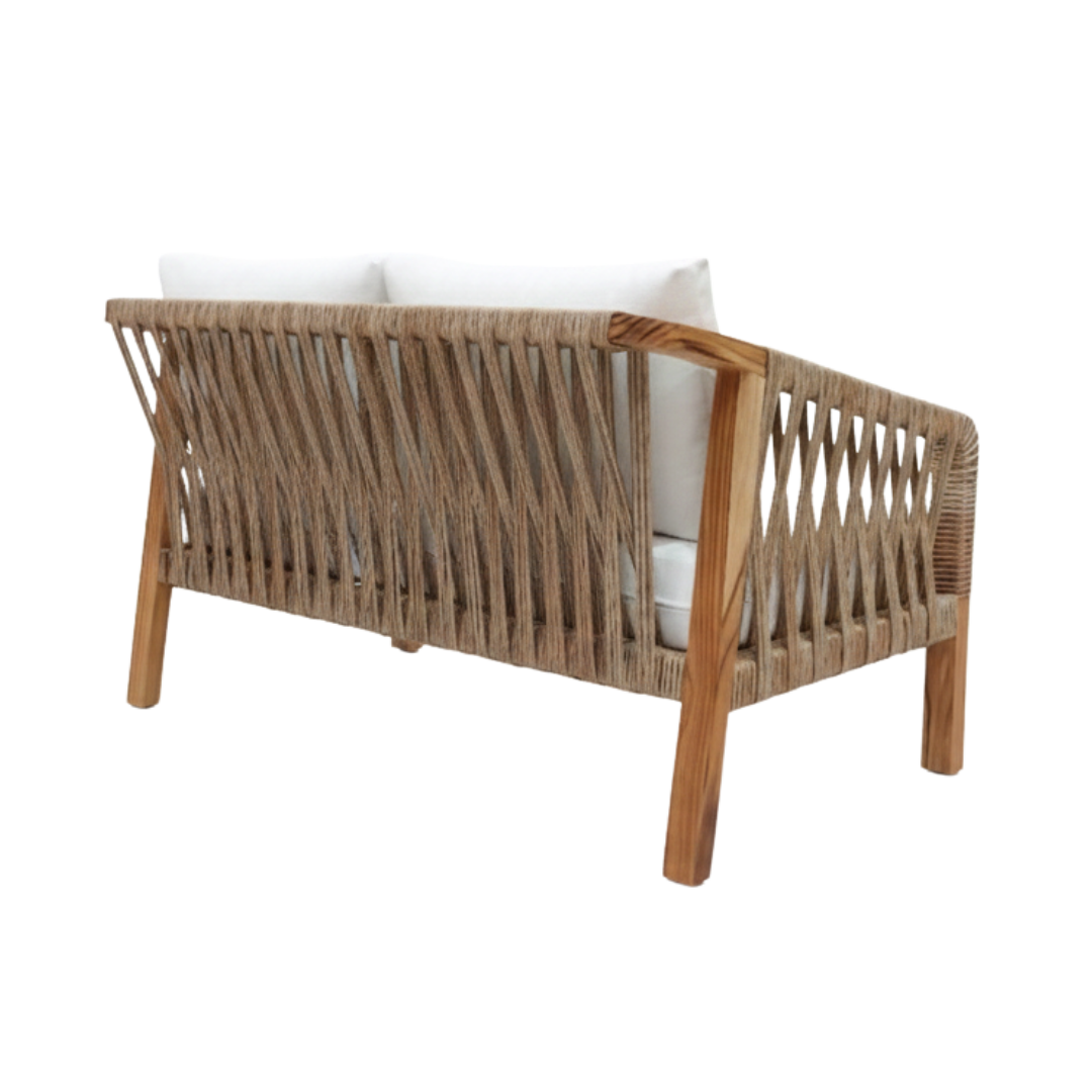 Materiales: Sala con estructura de madera, tejida con rejilla sintética de alta calidad, cojinería fabricada con hule espuma de alta densidad y tela resistente al sol y la intemperie.