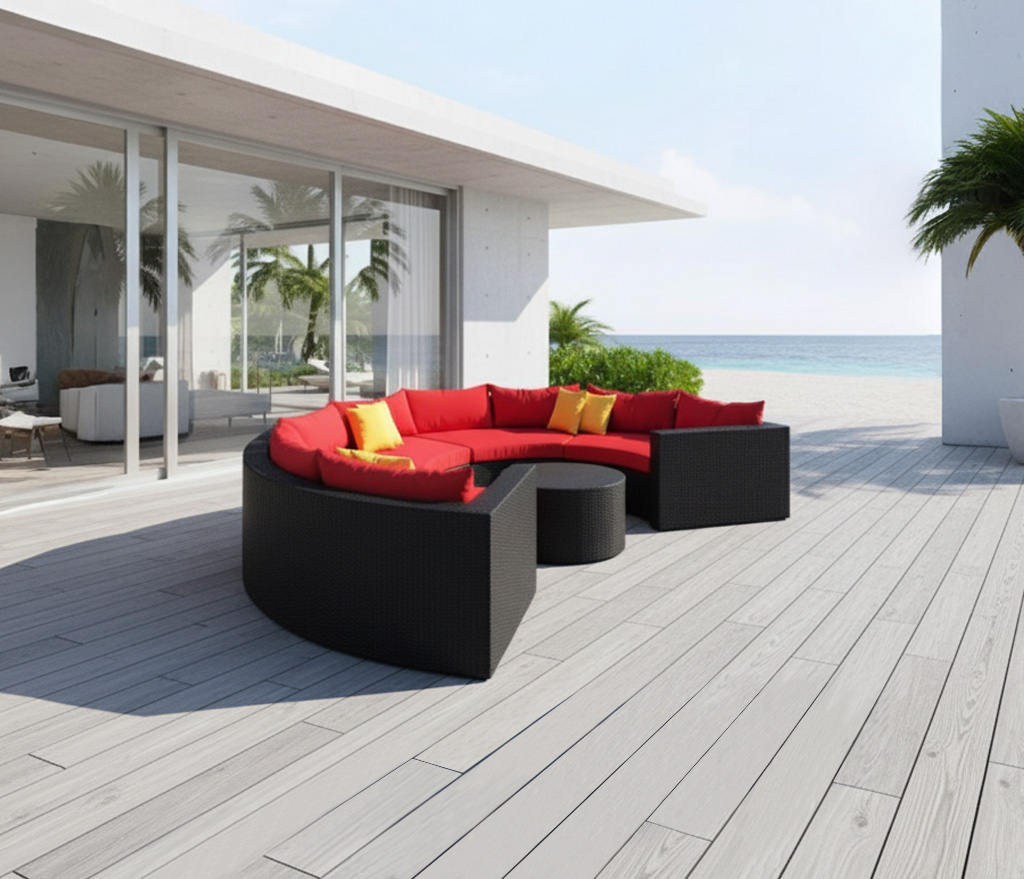 Materiales: Sala con estructura de aluminio, base de madera, tejida con rejilla sintética de alta calidad, cojinería fabricada con hule espuma de alta densidad y tela resistente al sol y la intemperie.