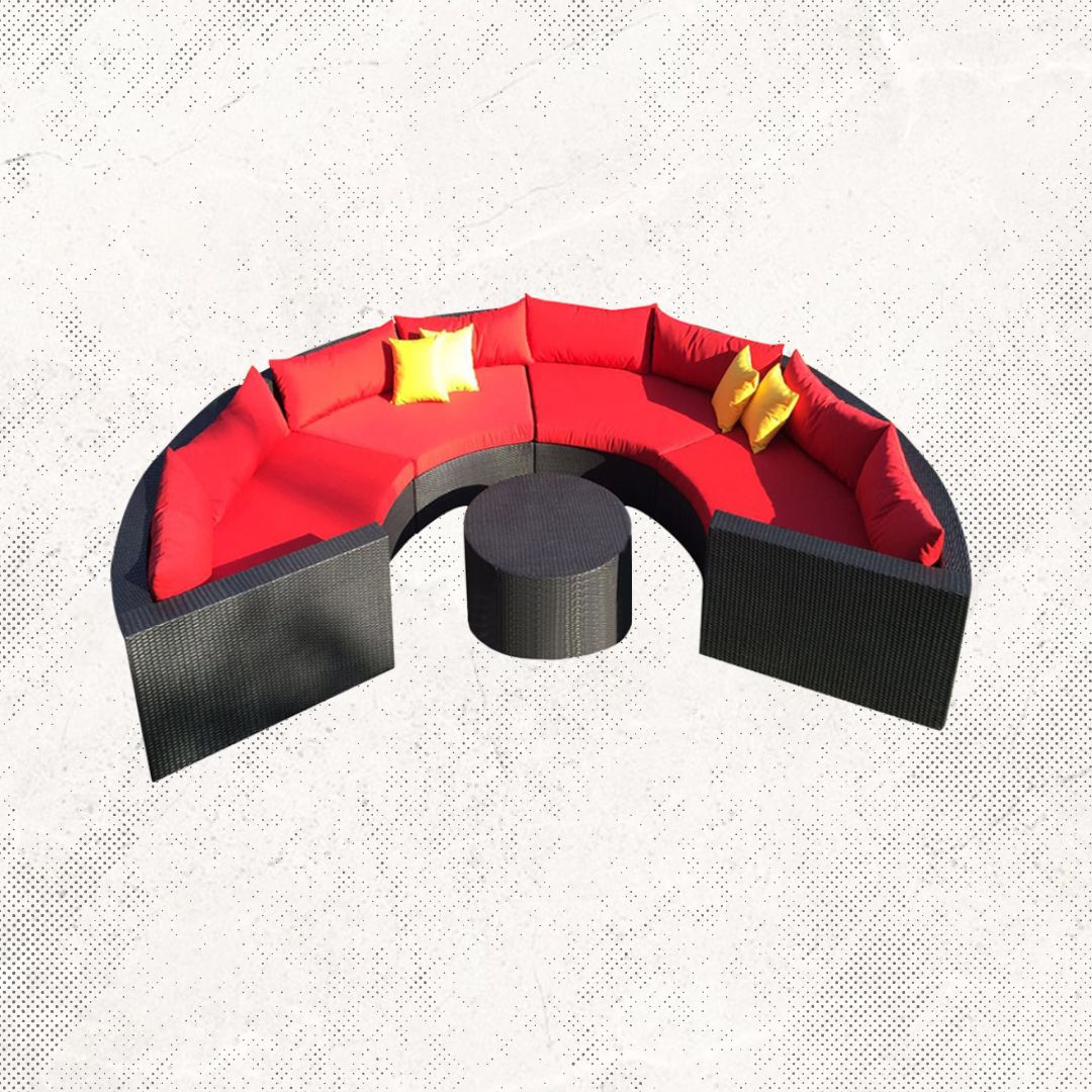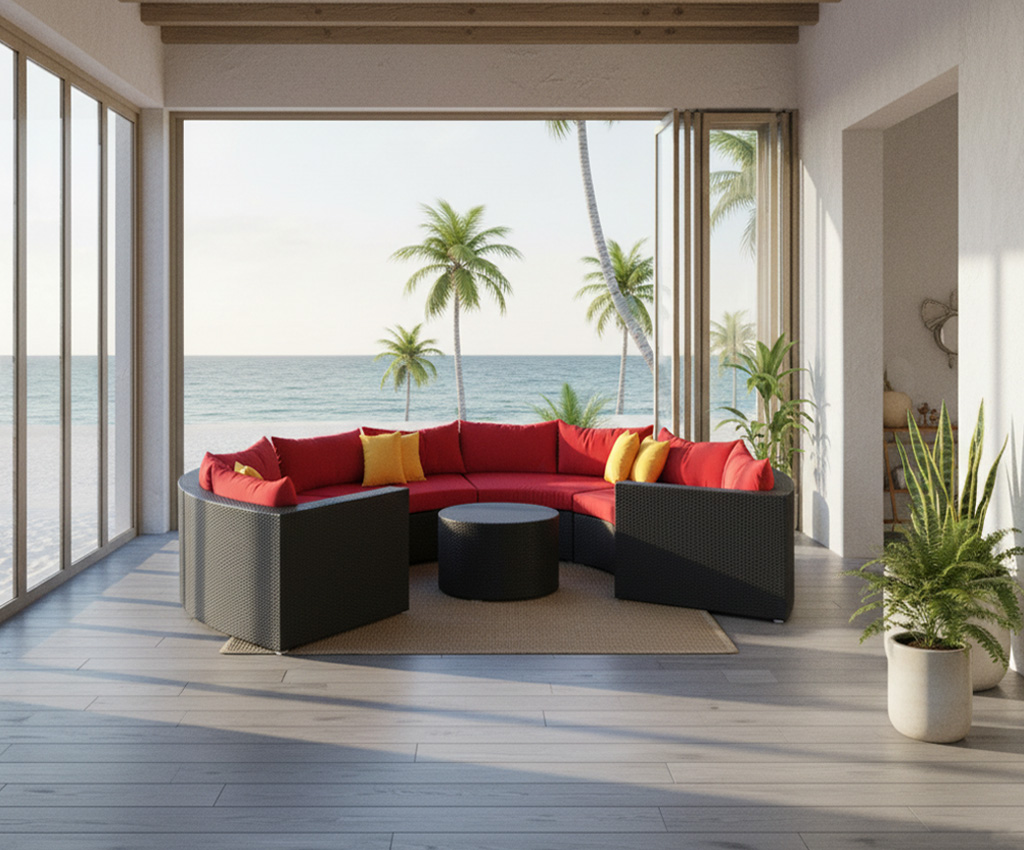 Materiales: Sala con estructura de aluminio, tejida con rejilla sintética de alta calidad, cojinería fabricada con hule espuma de alta densidad y tela resistente al sol y la intemperie.