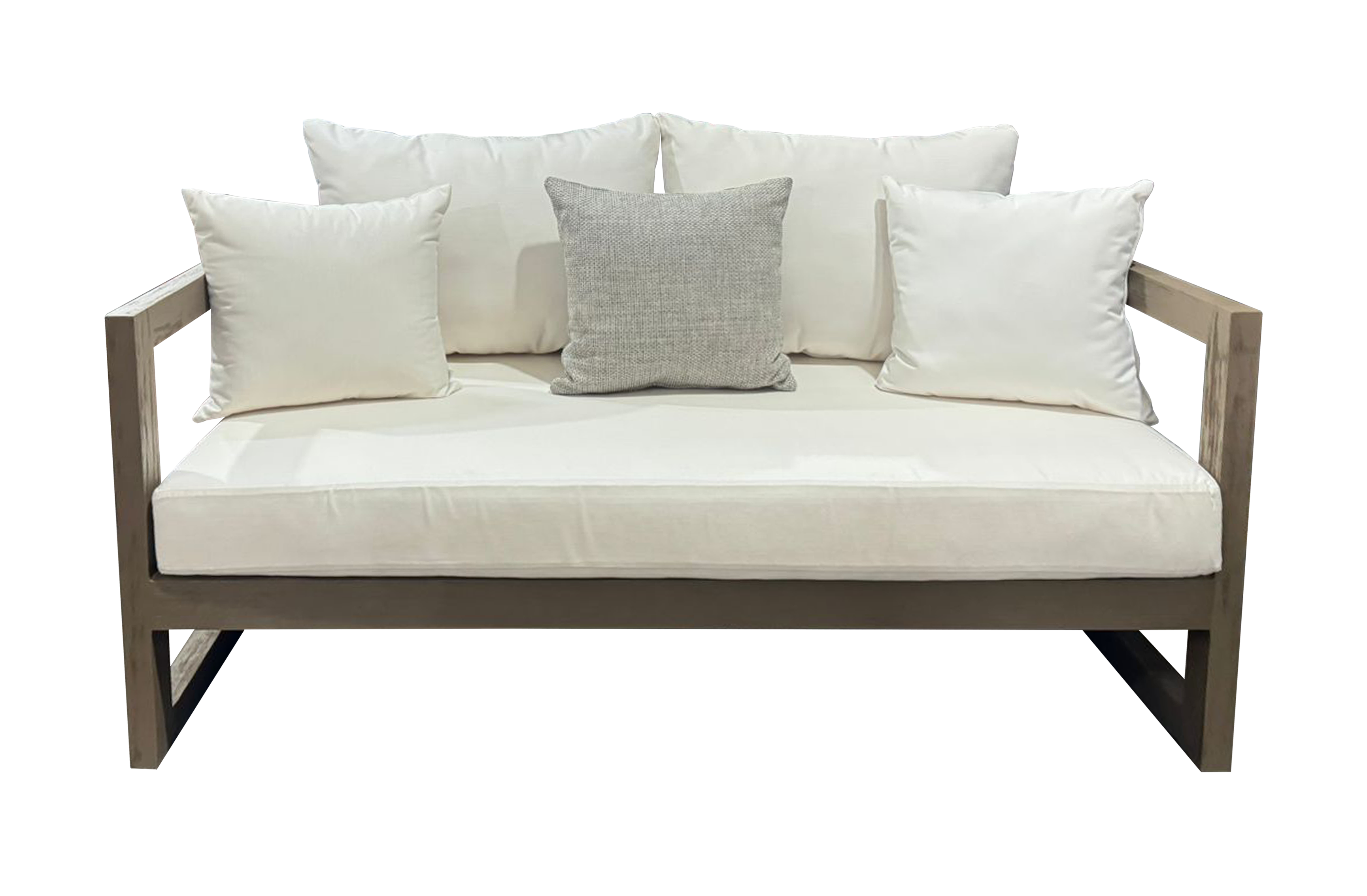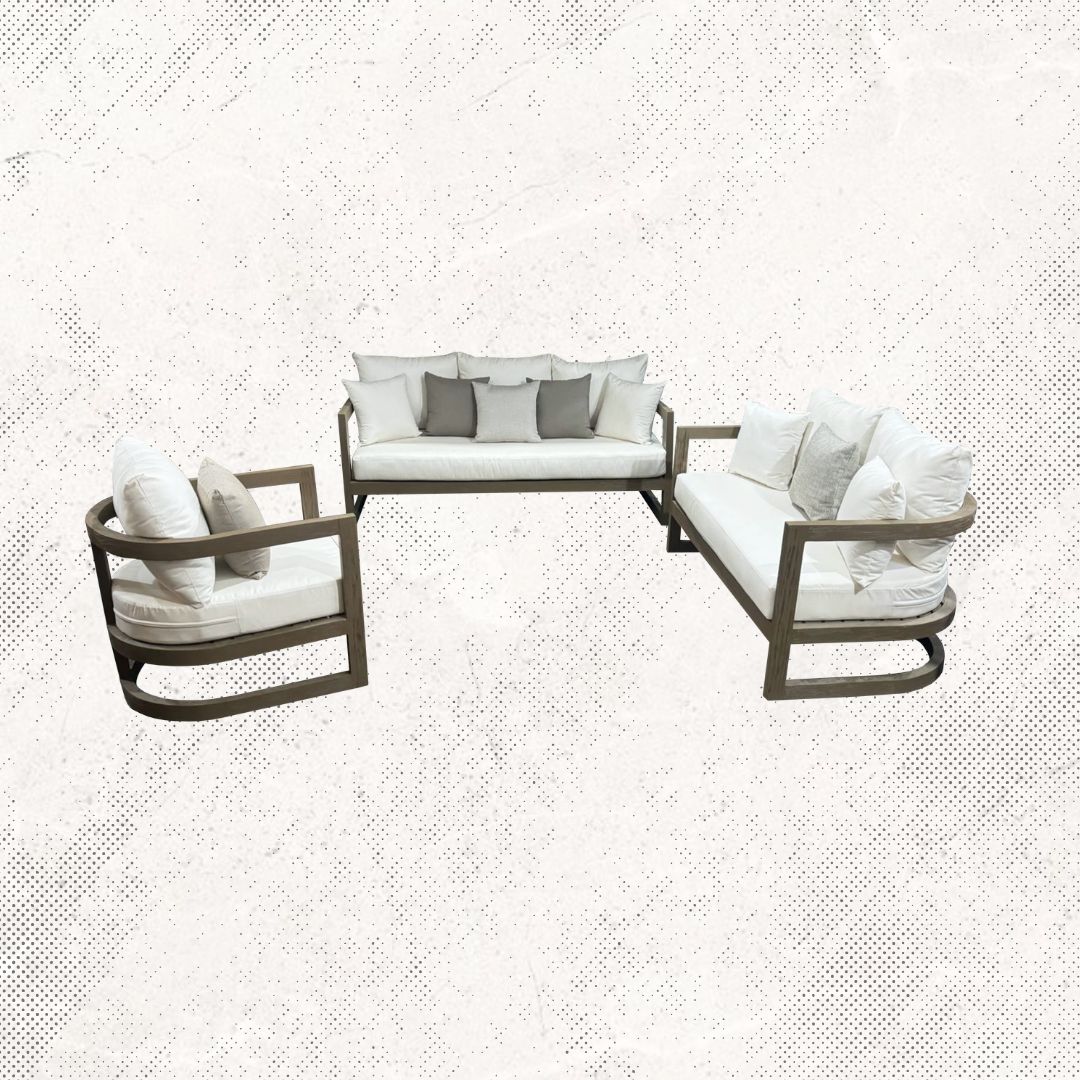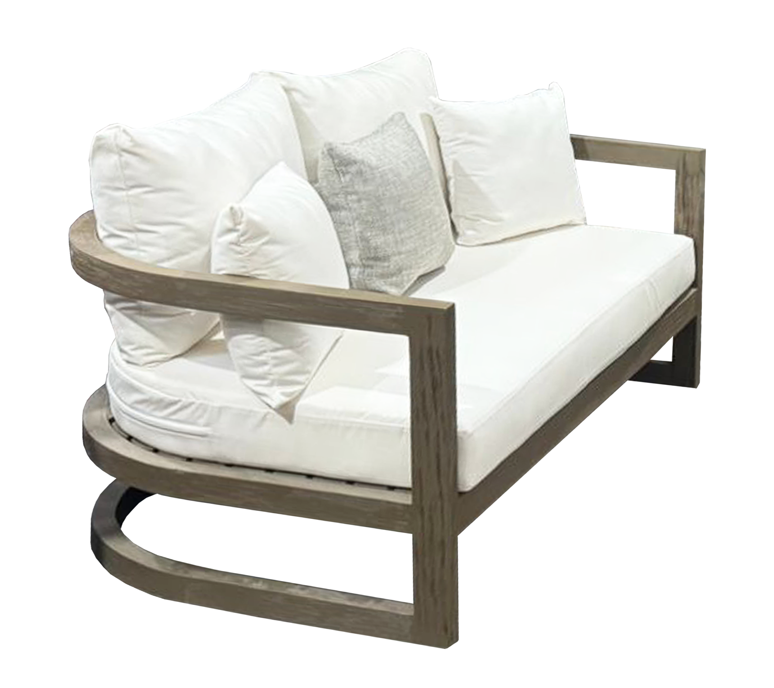 Materiales: Sofá fabricado con estructura de madera, cojinería fabricada con hule espuma de alta densidad y tela resistente al sol y la intemperie.