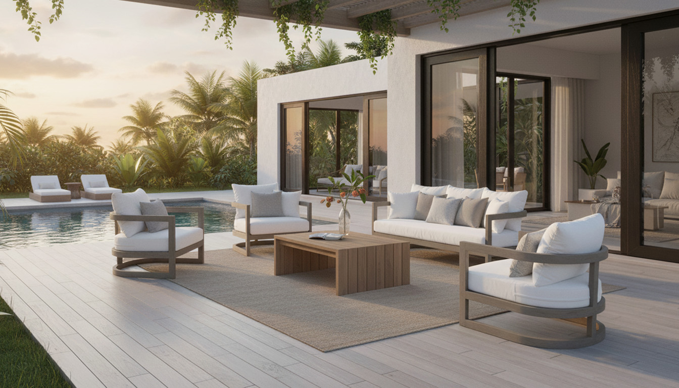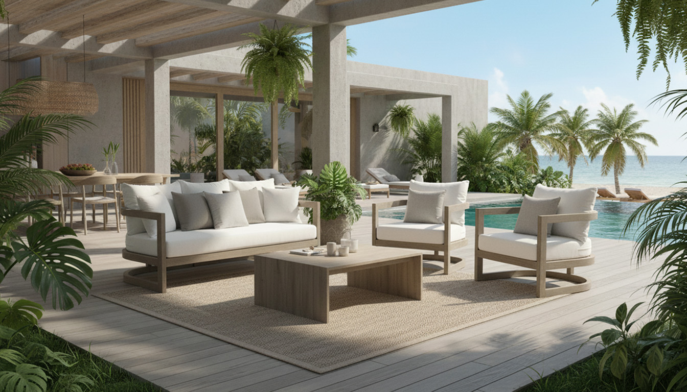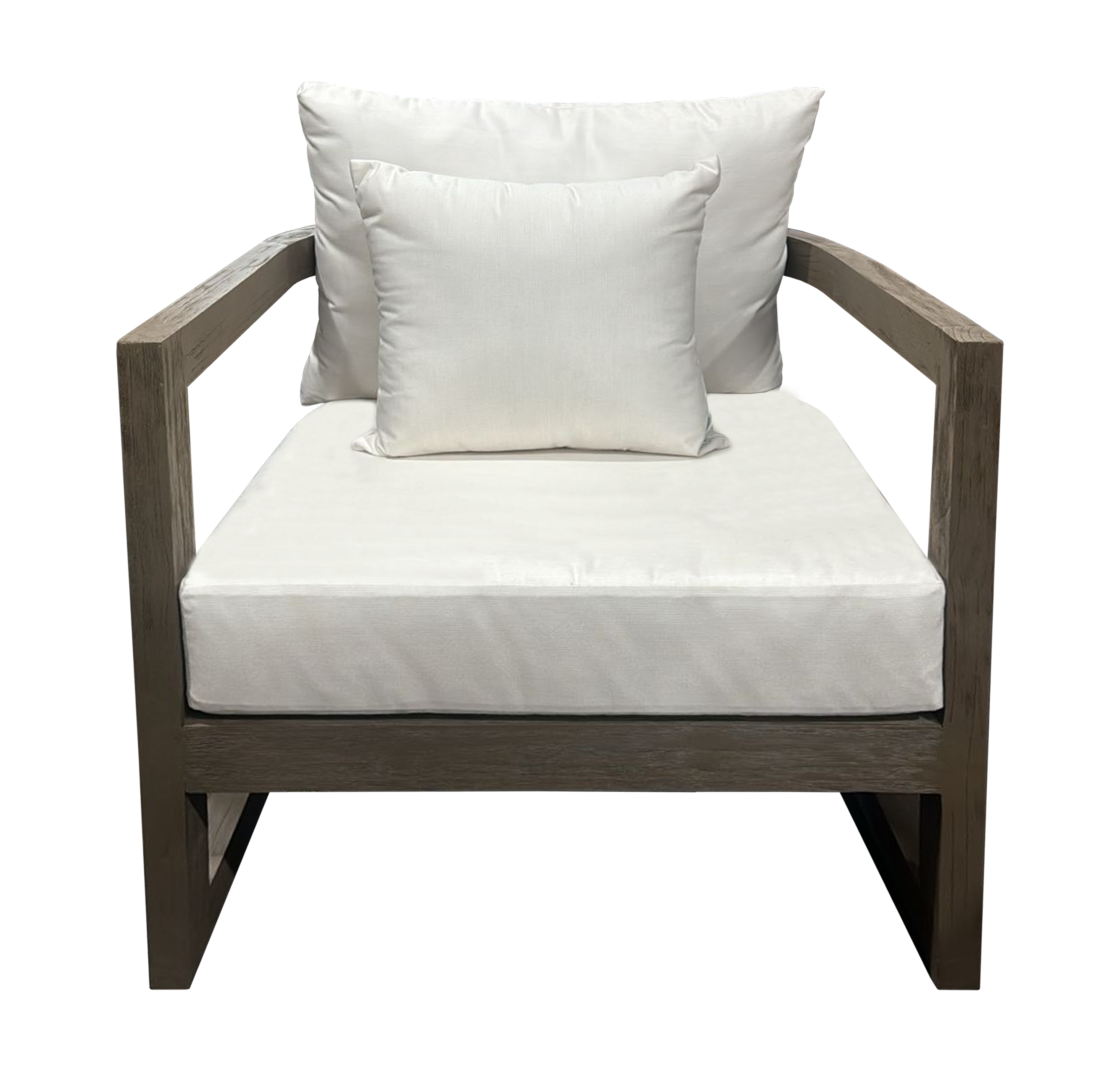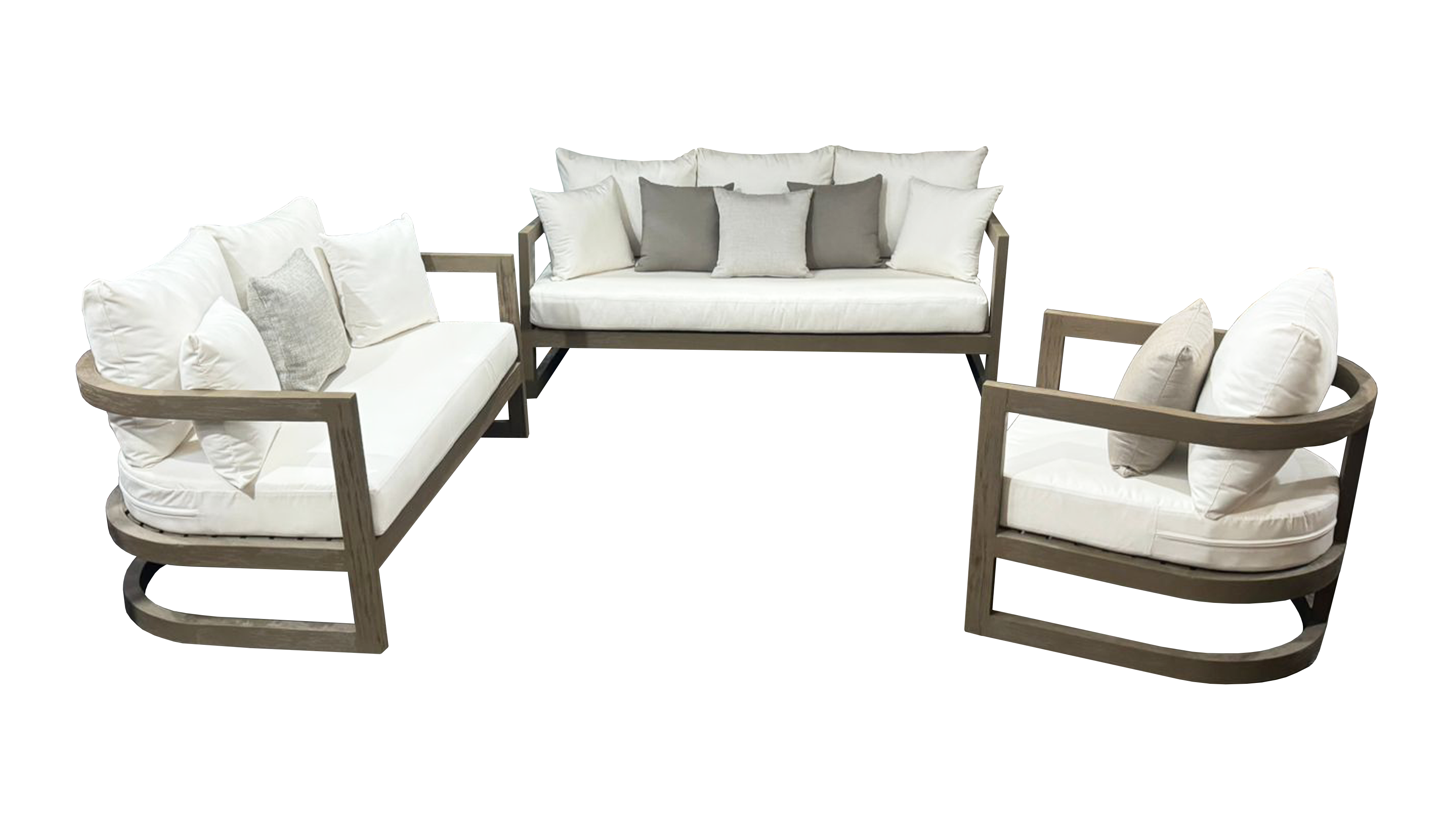 Materiales: Sofá fabricado con estructura de madera, cojinería fabricada con hule espuma de alta densidad y tela resistente al sol y la intemperie.