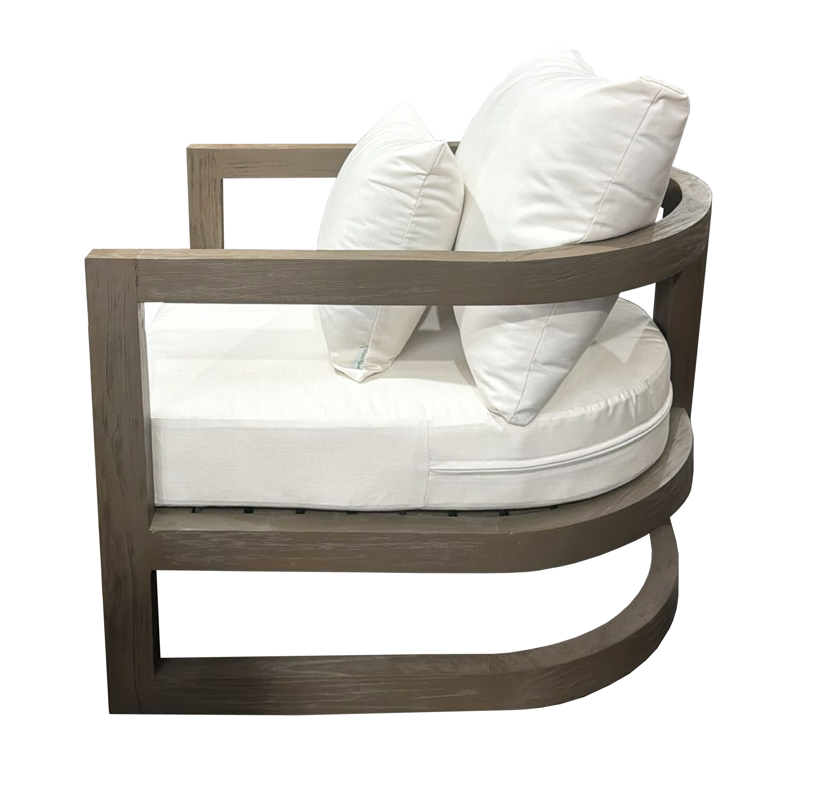 Armazón de aluminio, tejido con rejilla sintética, cojines en tela sumbrella, hule espuma de alta densidad.