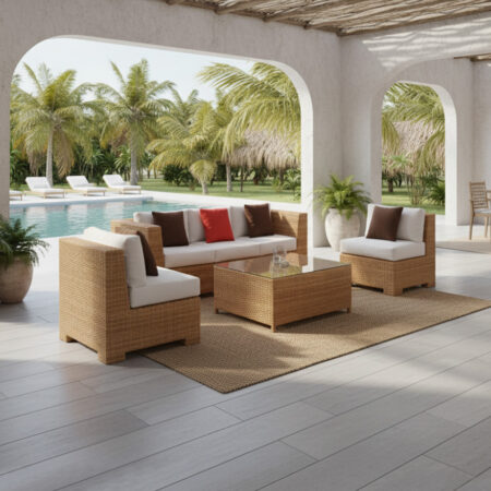 Materiales: Sala con estructura de madera, tejida con rejilla sintética de alta calidad, cojinería fabricada con hule espuma de alta densidad y tela resistente al sol y la intemperie.